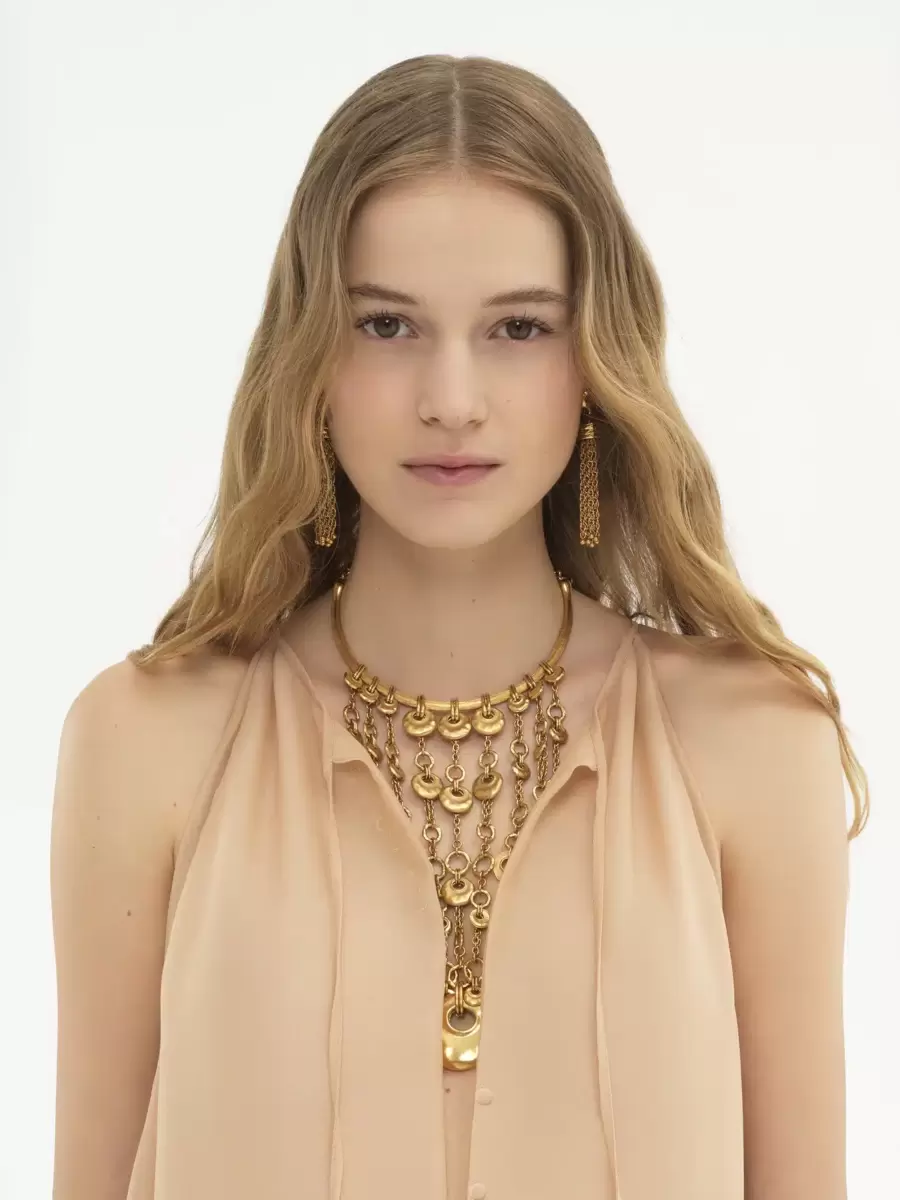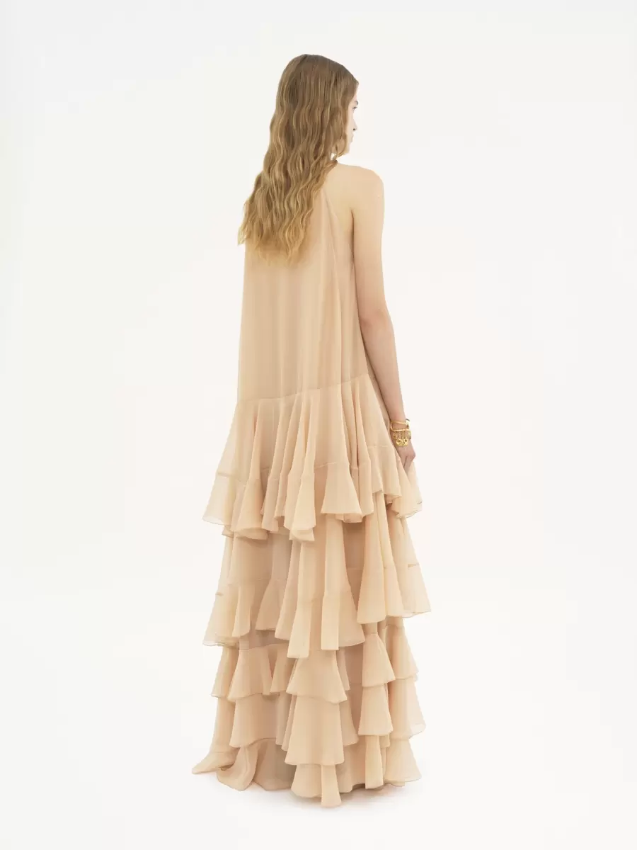 Abito lungo senza maniche a balze in georgette di seta organica semitrasparente con fodera in misto seta, caratterizzato da profonda scollatura a V, balze a cascata e lacci pendenti rifiniti con punte dorate.