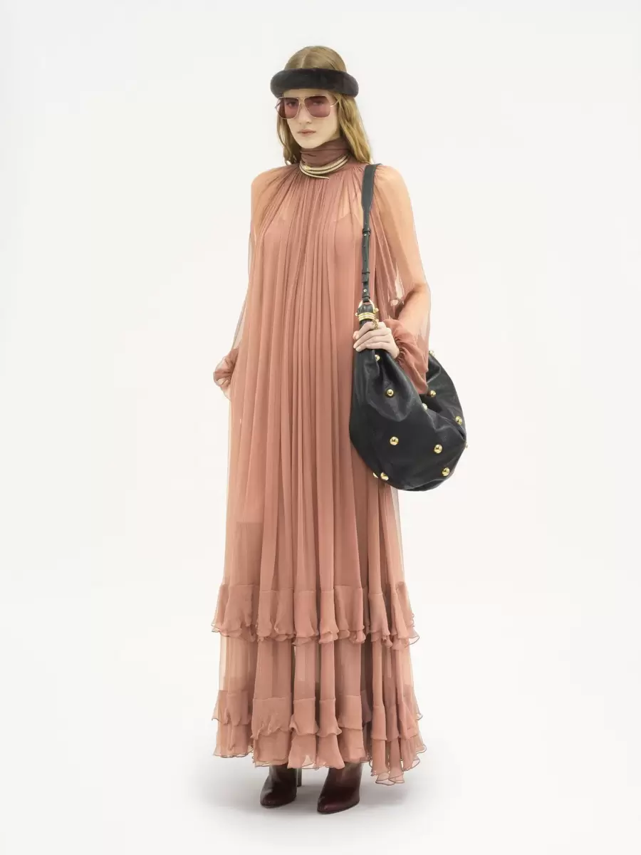 Abito lungo oversize arricciato in mousseline di seta biologica con laccetto lavallière, bottoni ricoperti e orlo a balze a balze.