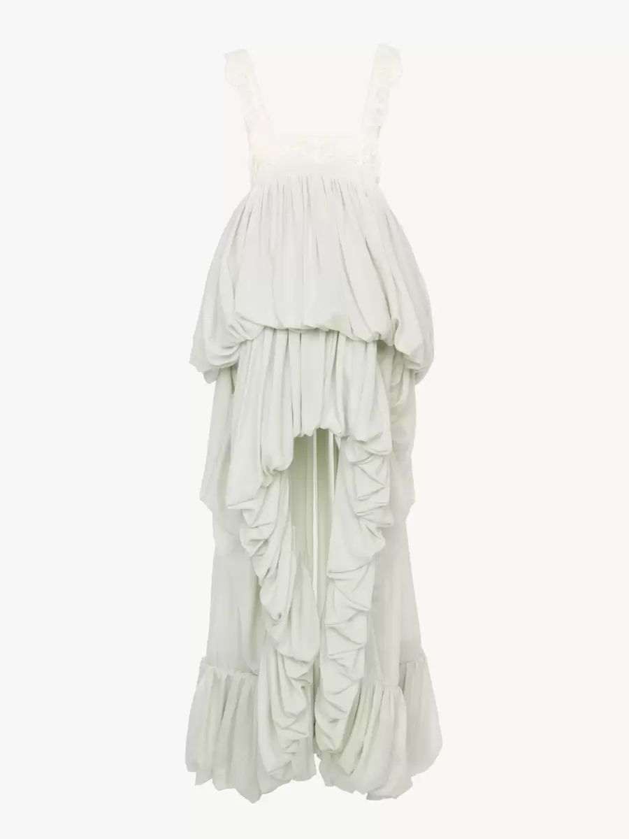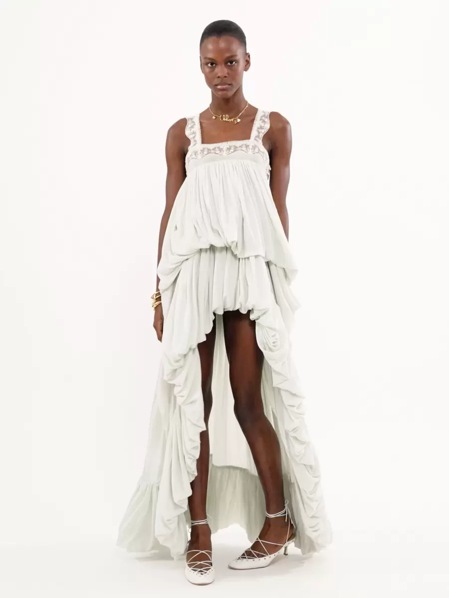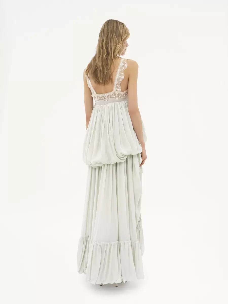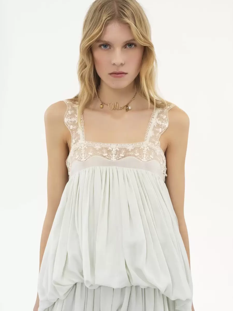 Questo prodotto è stato realizzato da Marie Helene Couture, partner di lunga data di Chloé con sede a Morlaas, in Francia. Marie Helene Couture eccelle nella tecnica specializzata della couture “flou”. La loro competenza è in linea con i rigorosi standard stabiliti dalla certificazione “métiers de la mode, vêtement flou”, garantendo un elevato livello di attitudine professionale in questa delicata e qualificata forma d’arte.