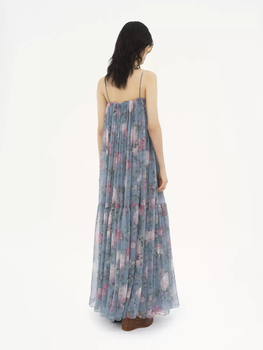 Abito lungo senza maniche in mousseline di seta organica con fodera in misto seta, caratterizzato da una stampa all-over di peonie ispirata alla tradizione della Maison. Le spalline sottili completano la silhouette fluida e a strati.