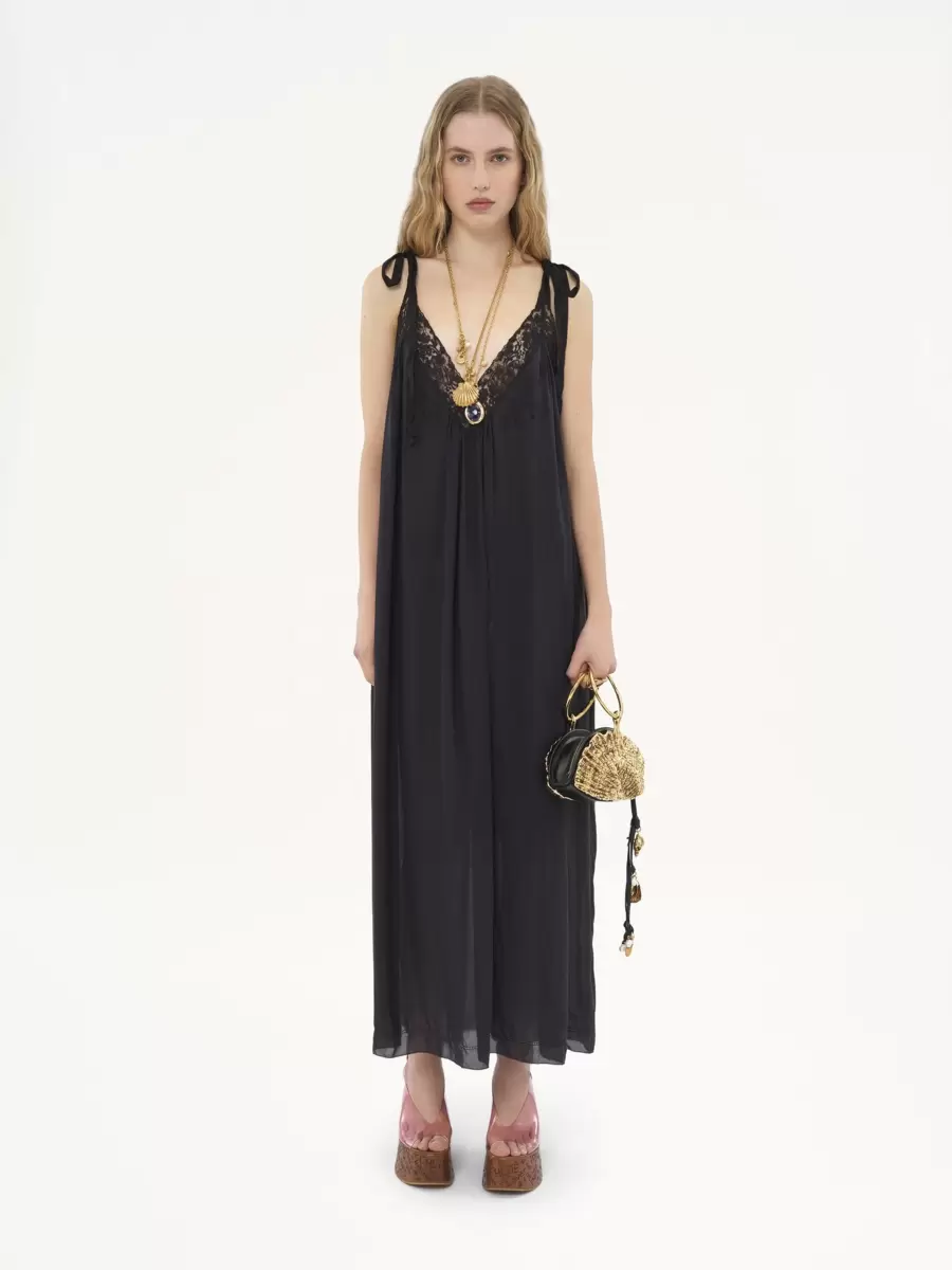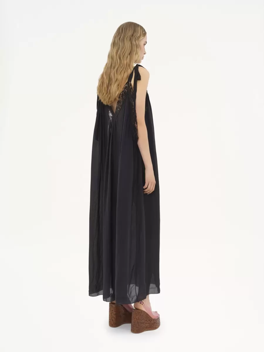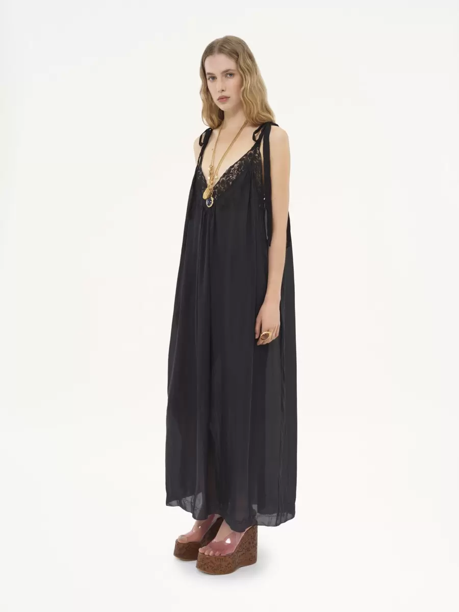 Abito lungo e fluido in charmeuse di seta organica leggera con bordo in pizzo lungo lo scollo a V e sottili spalline annodate sulle spalle. Una fodera separata completa questo capo.