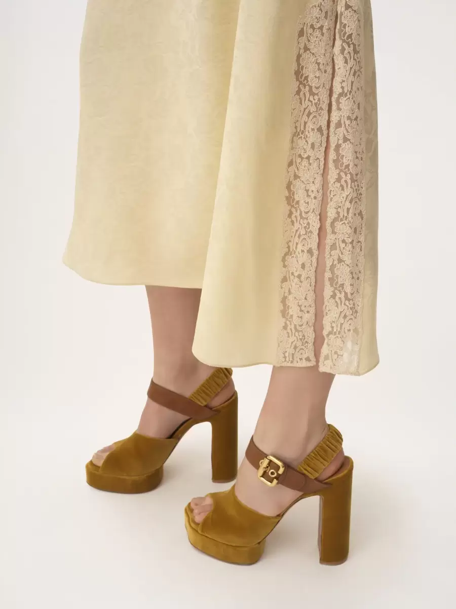 Abito midi con spalline sottili in seta biologica con jacquard di rose, inserti in pizzo e dettagli arricciati.