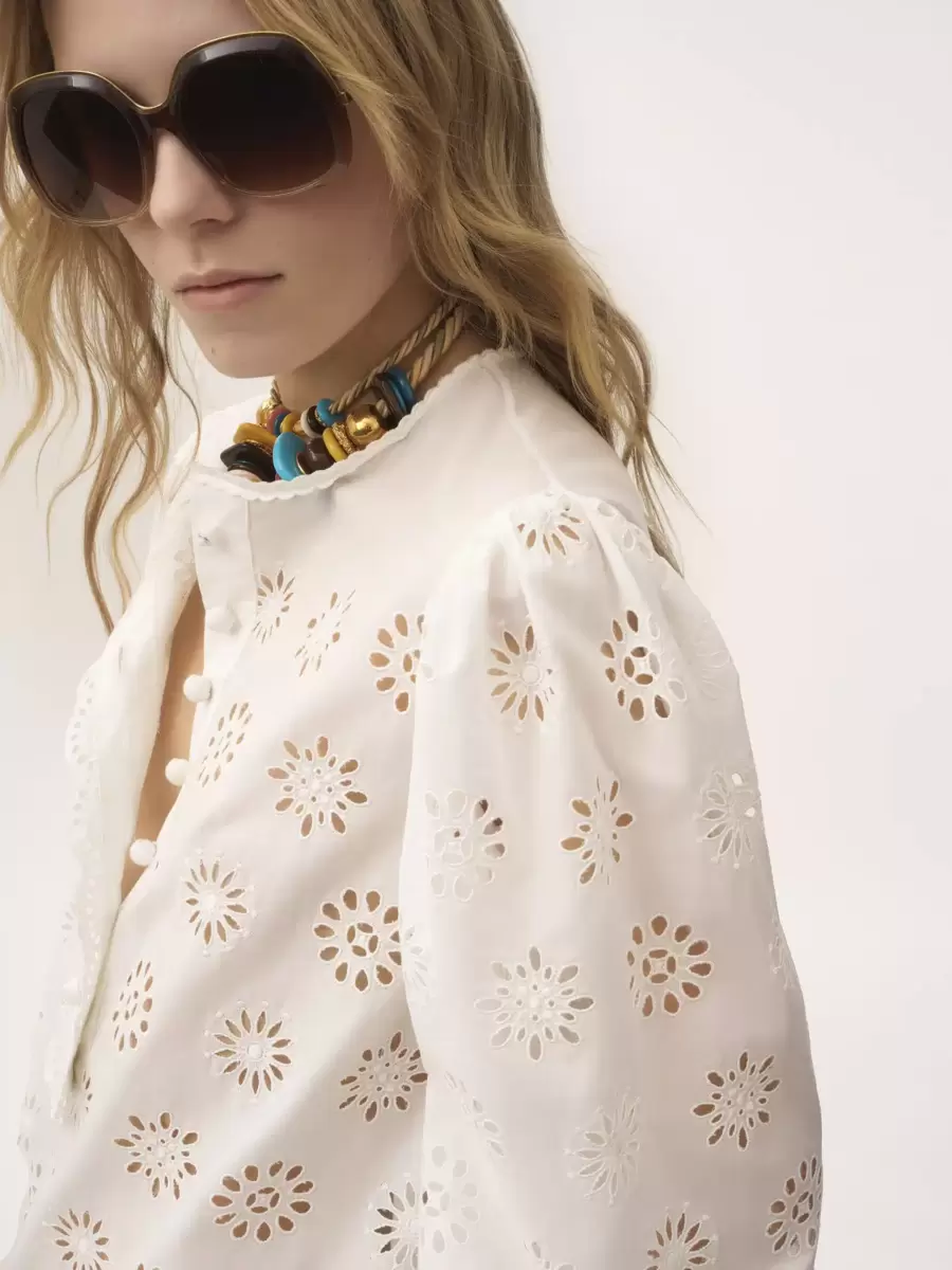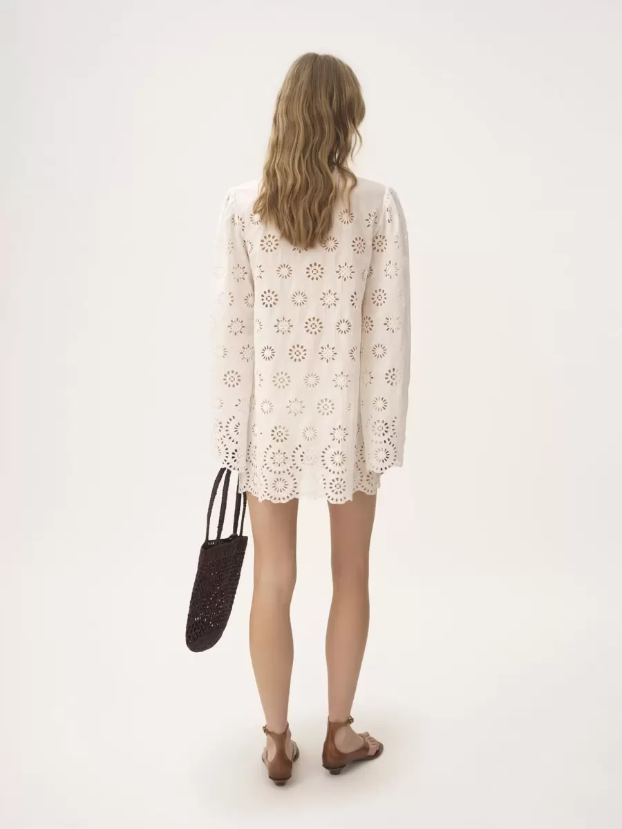 Miniabito a maniche lunghe con scollo tondo in voile di cotone con ricamo inglese floreale e fodera separata in cotone, con bottoni ricoperti in tessuto sul davanti.