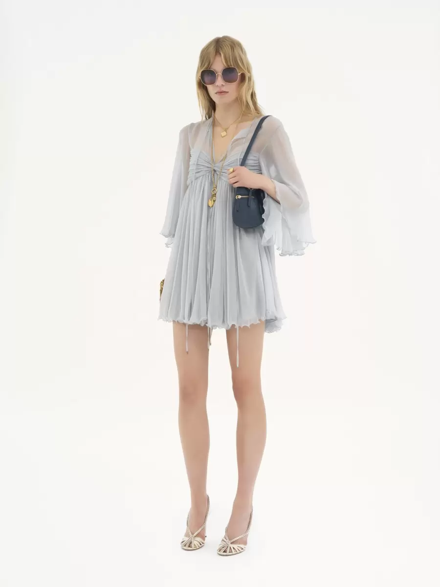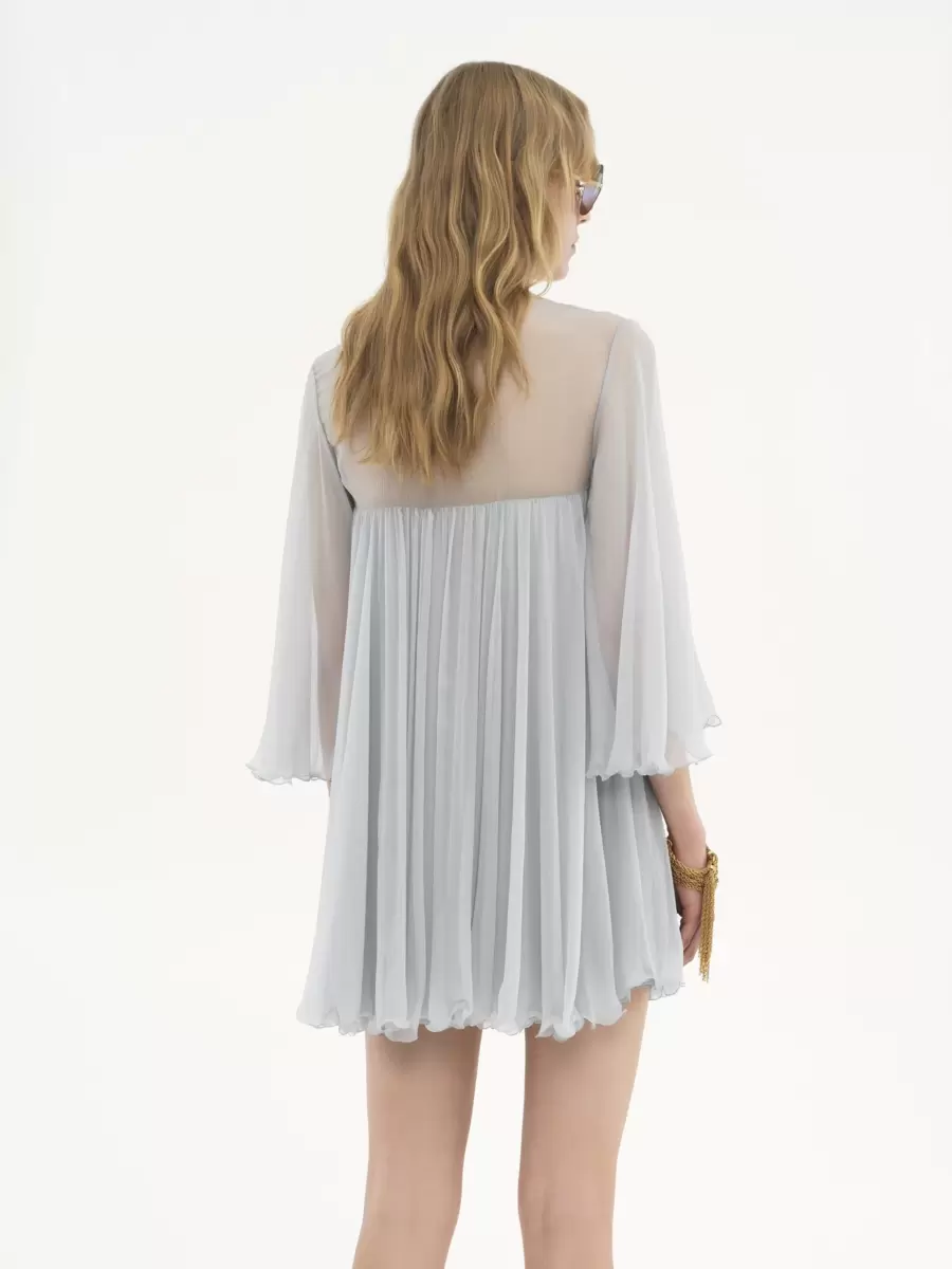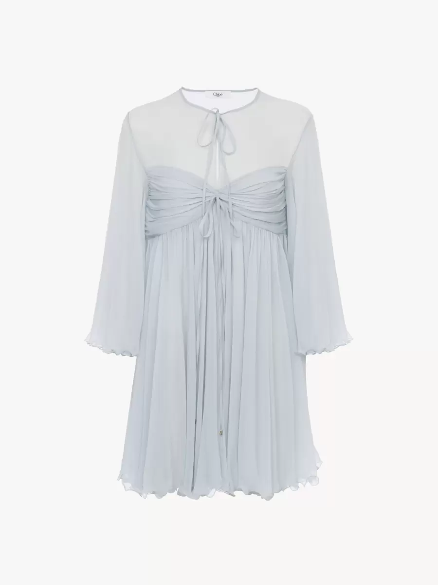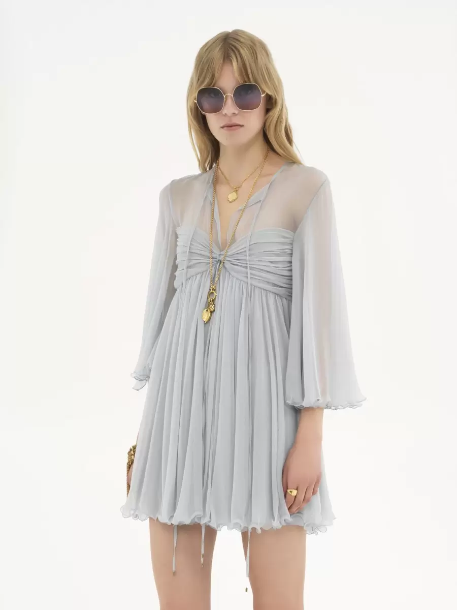 Miniabito fluido a pieghe in mousseline di seta trasparente con fodera in misto seta, caratterizzato da delicate arricciature e lacci pendenti rifiniti con punte metalliche.
