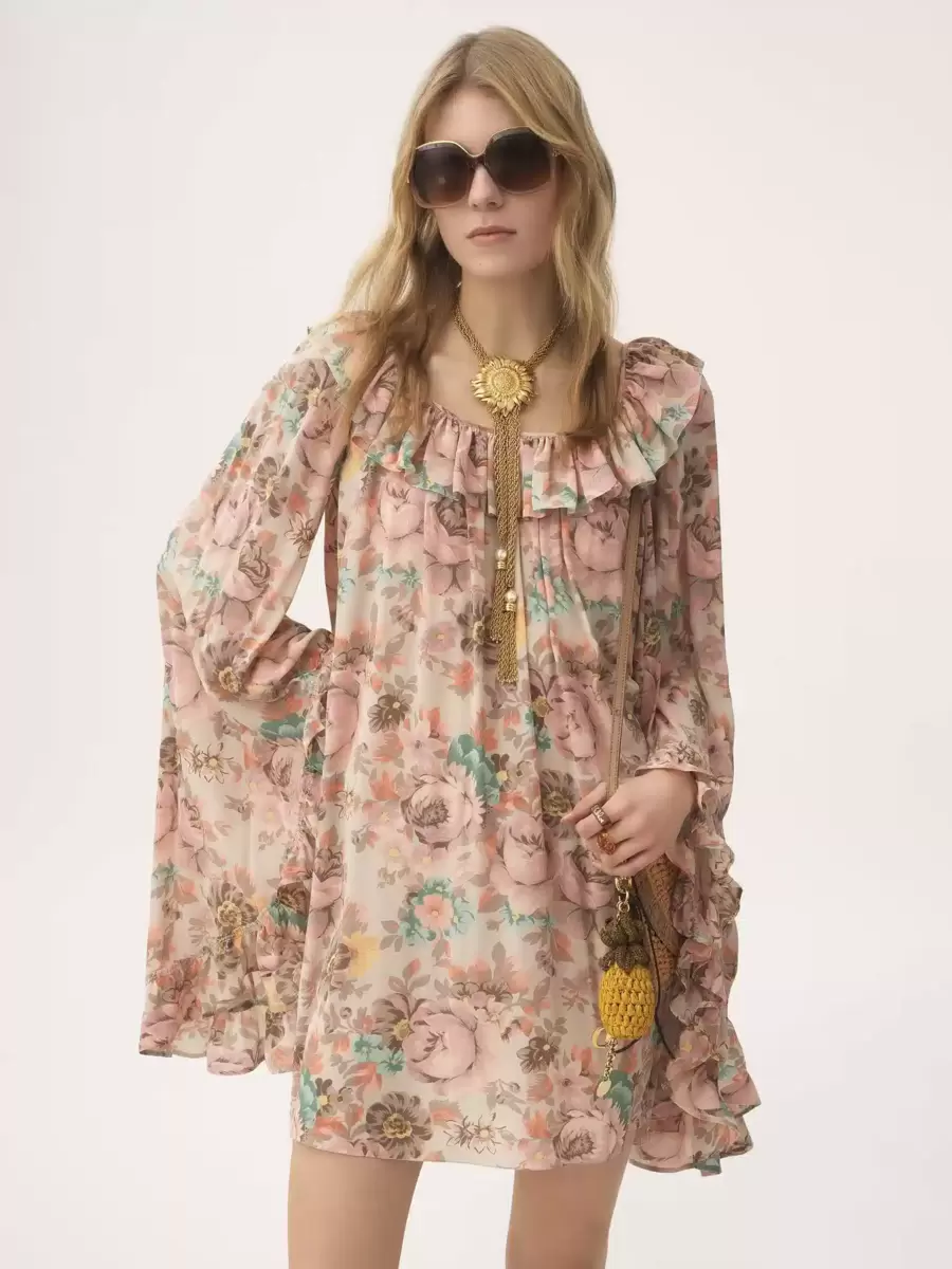 Miniabito con scollo quadrato e volant in crêpe de chine di seta biologica con stampa floreale ispirata alla tradizione della Maison. La silhouette fluida presenta scollature a balze e maniche lunghe.