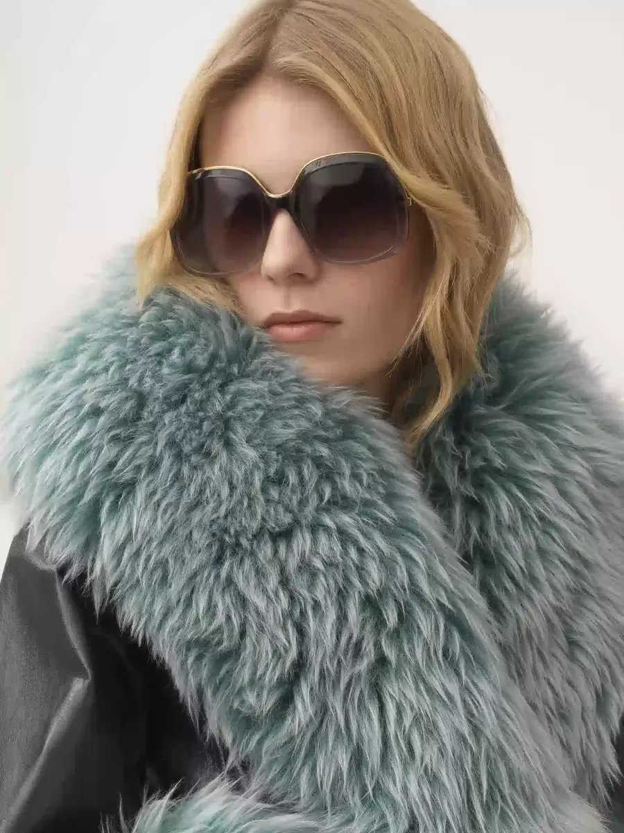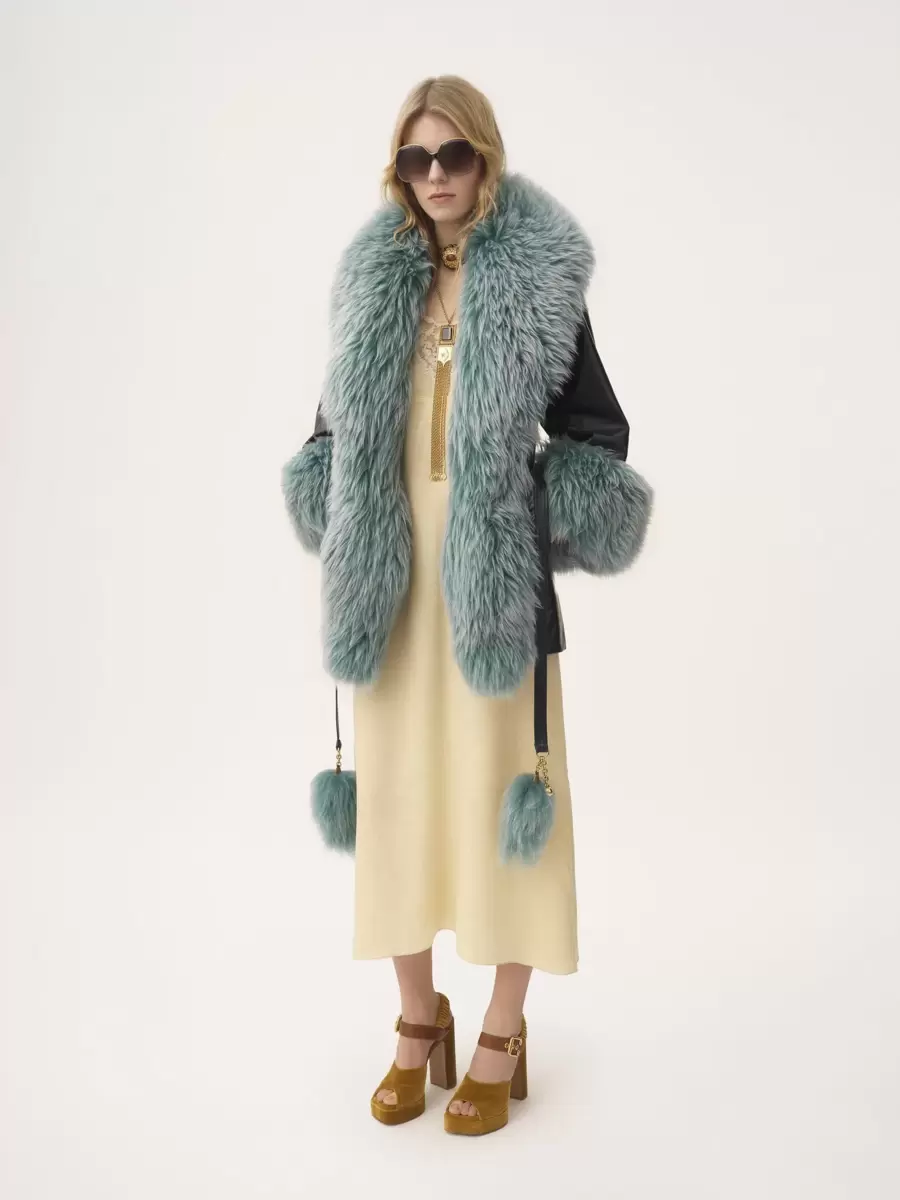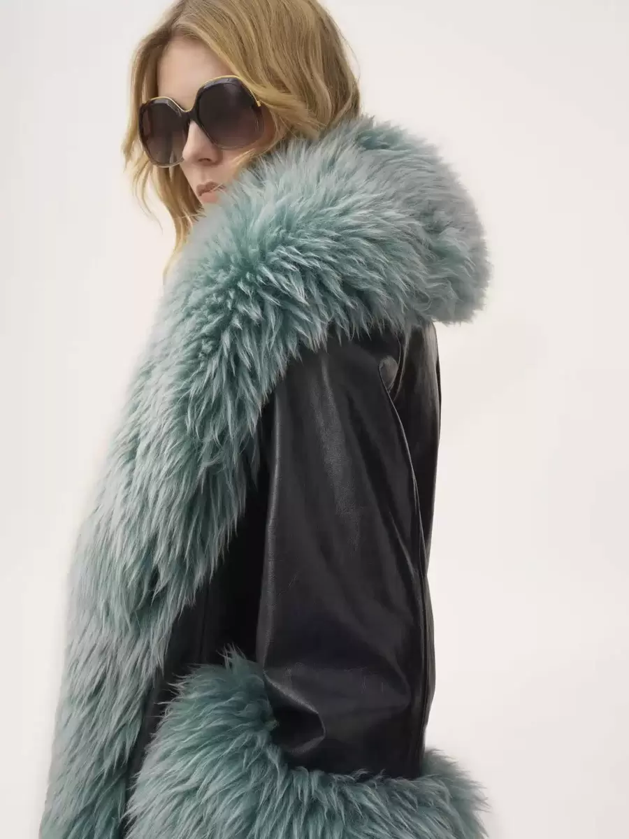 Cappotto corto in pelle di vacchetta lucida con finiture in shearling a contrasto, cintura in pelle tono su tono con dettagli decorativi color oro e bottoni in corno nascosti.