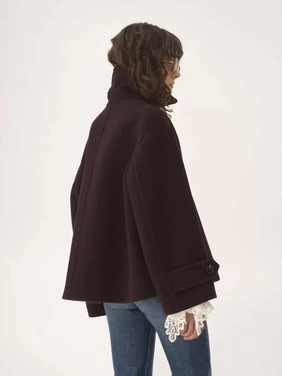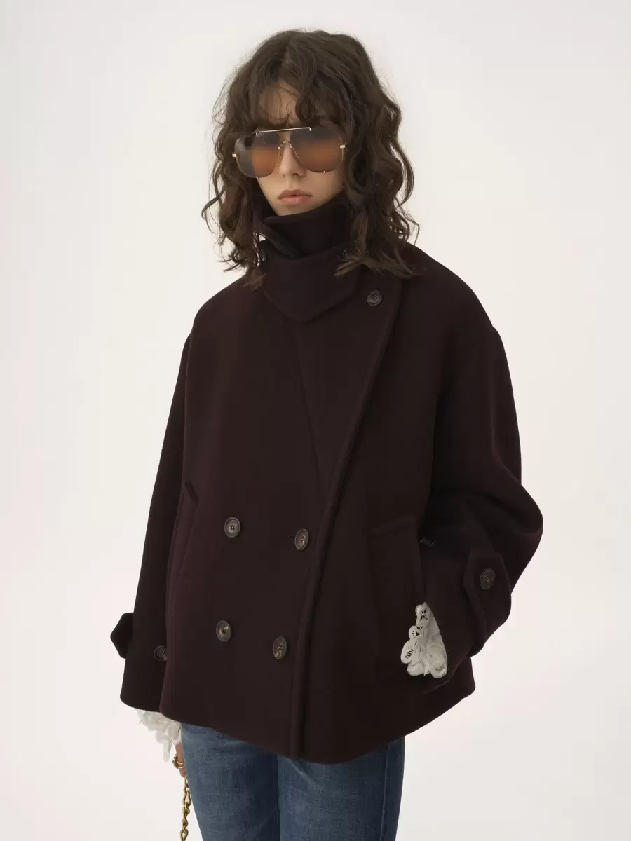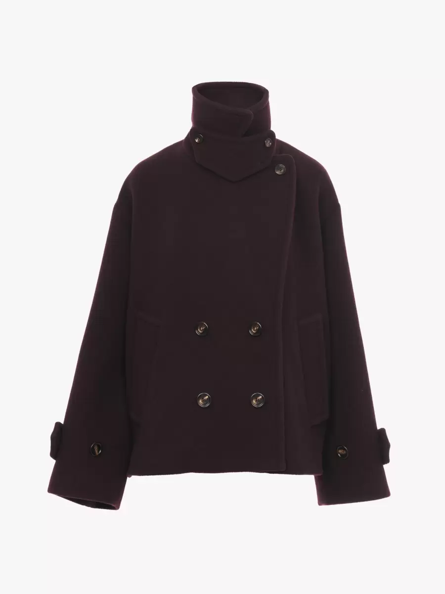 Cappotto corto oversize doppiopetto in iconica lana morbida con collo a cinturino e bottoni in corno incisi.