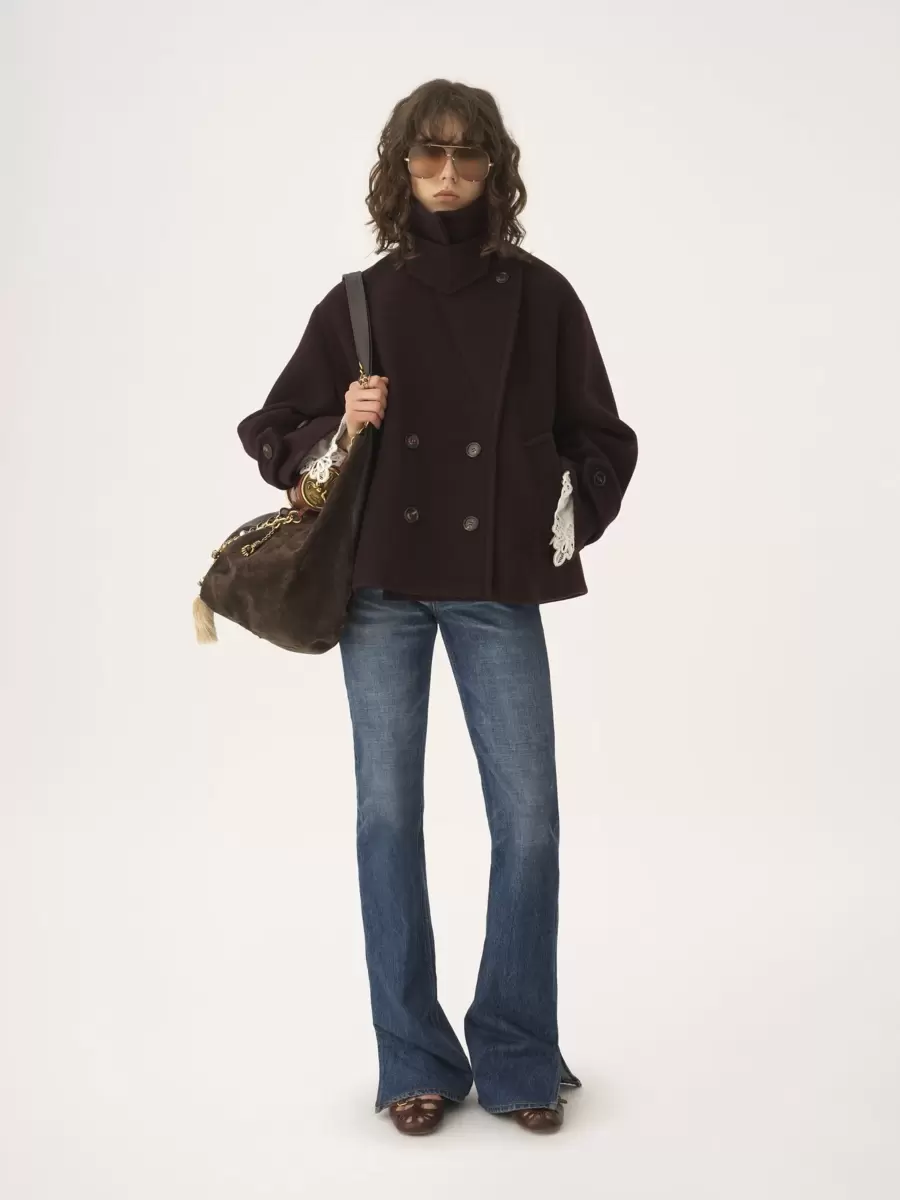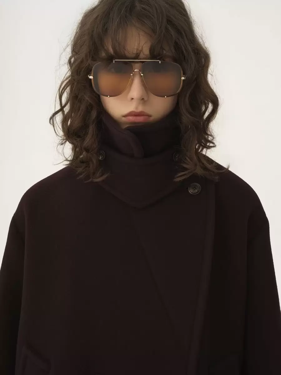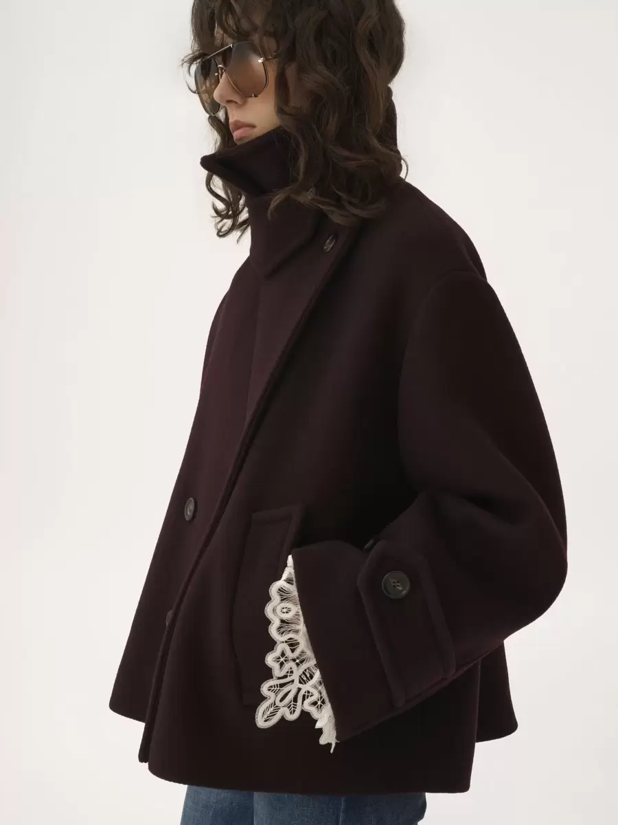 Cappotto corto oversize doppiopetto in iconica lana morbida con collo a cinturino e bottoni in corno incisi.