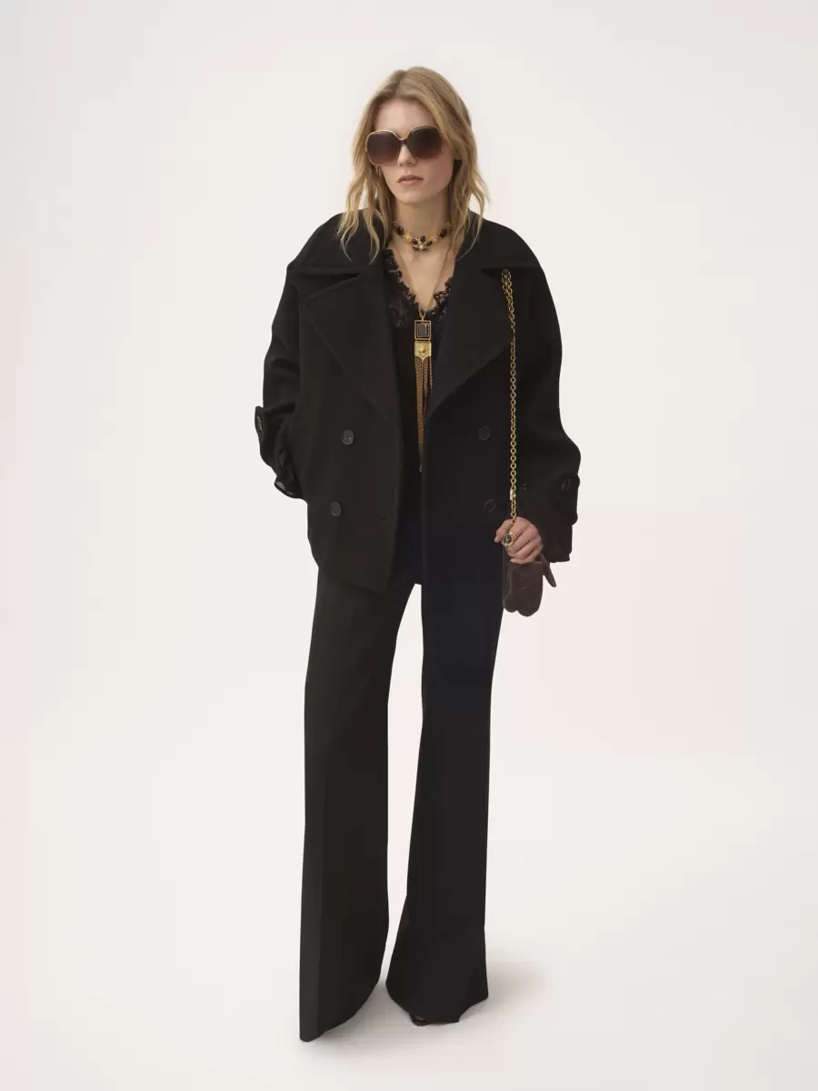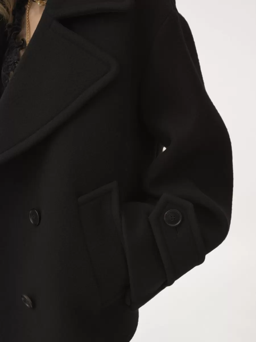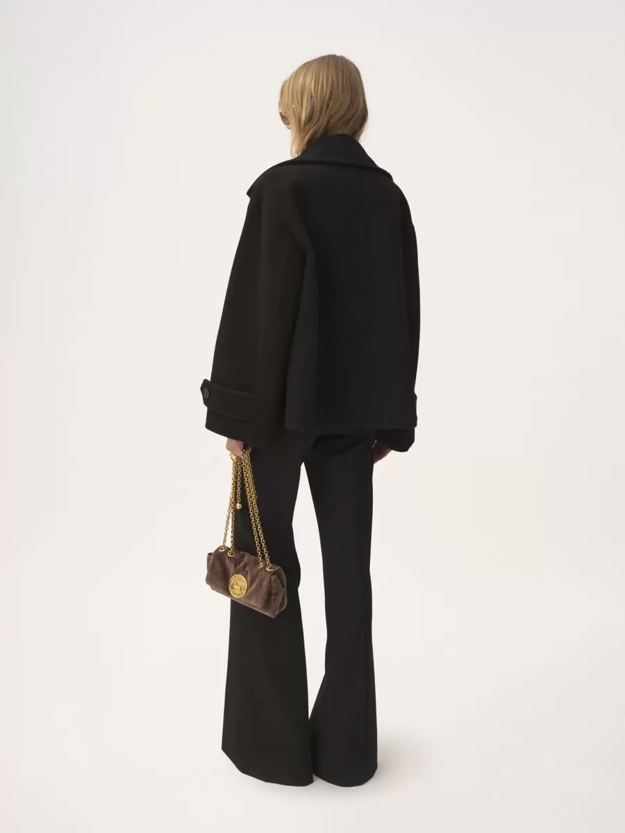 Cappotto corto oversize doppiopetto in iconica lana morbida con collo a cinturino e bottoni in corno.