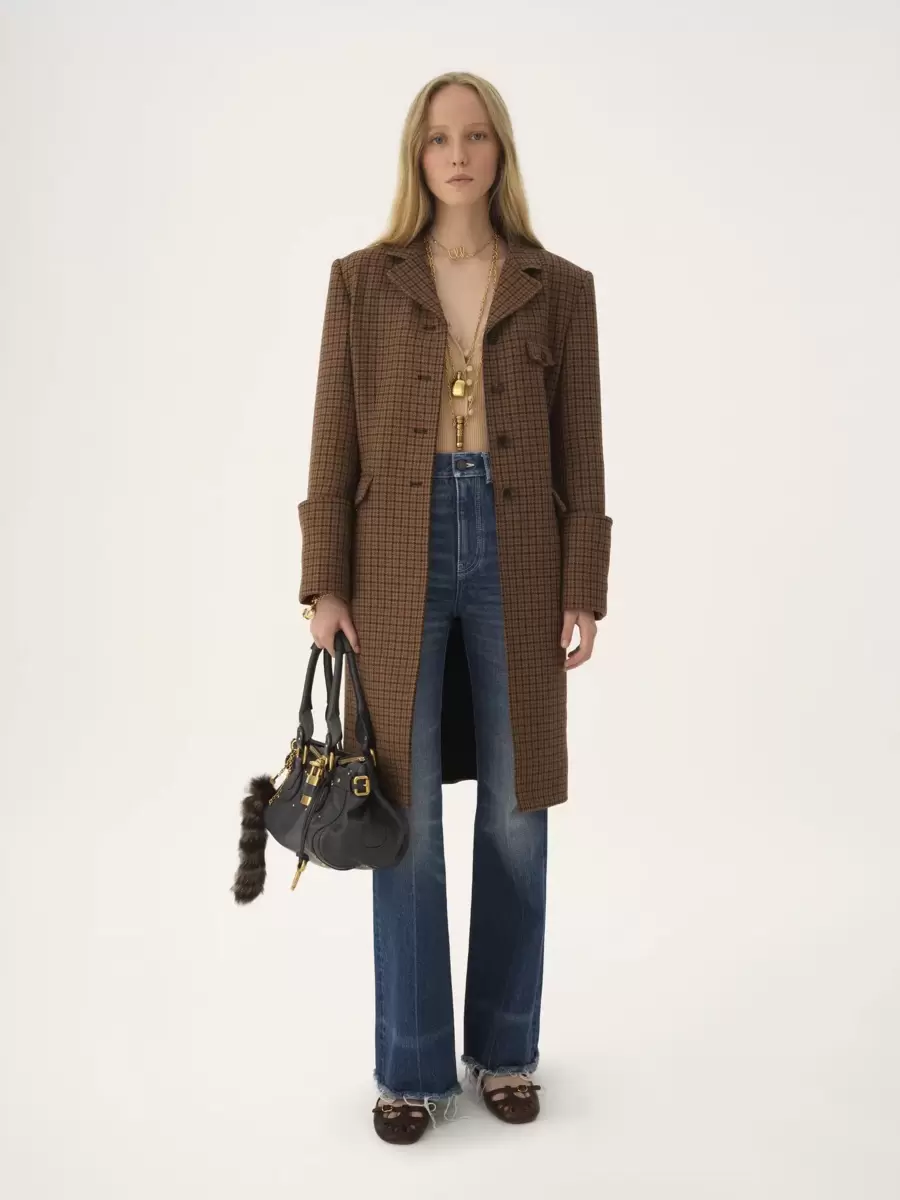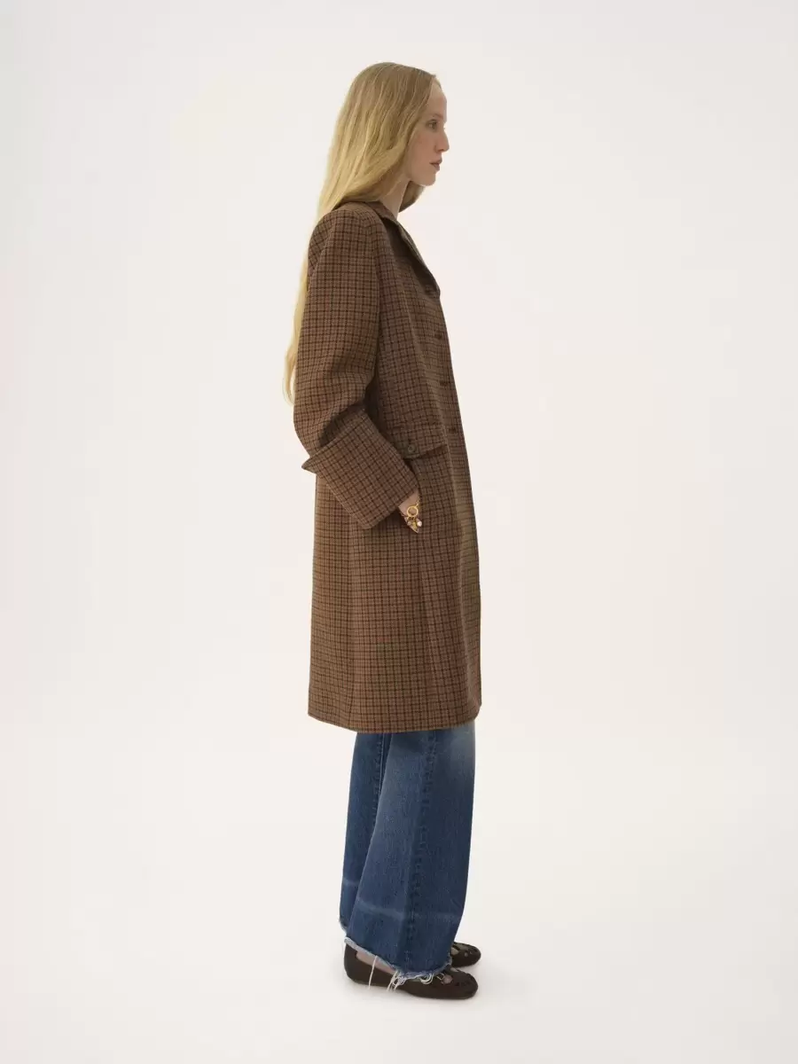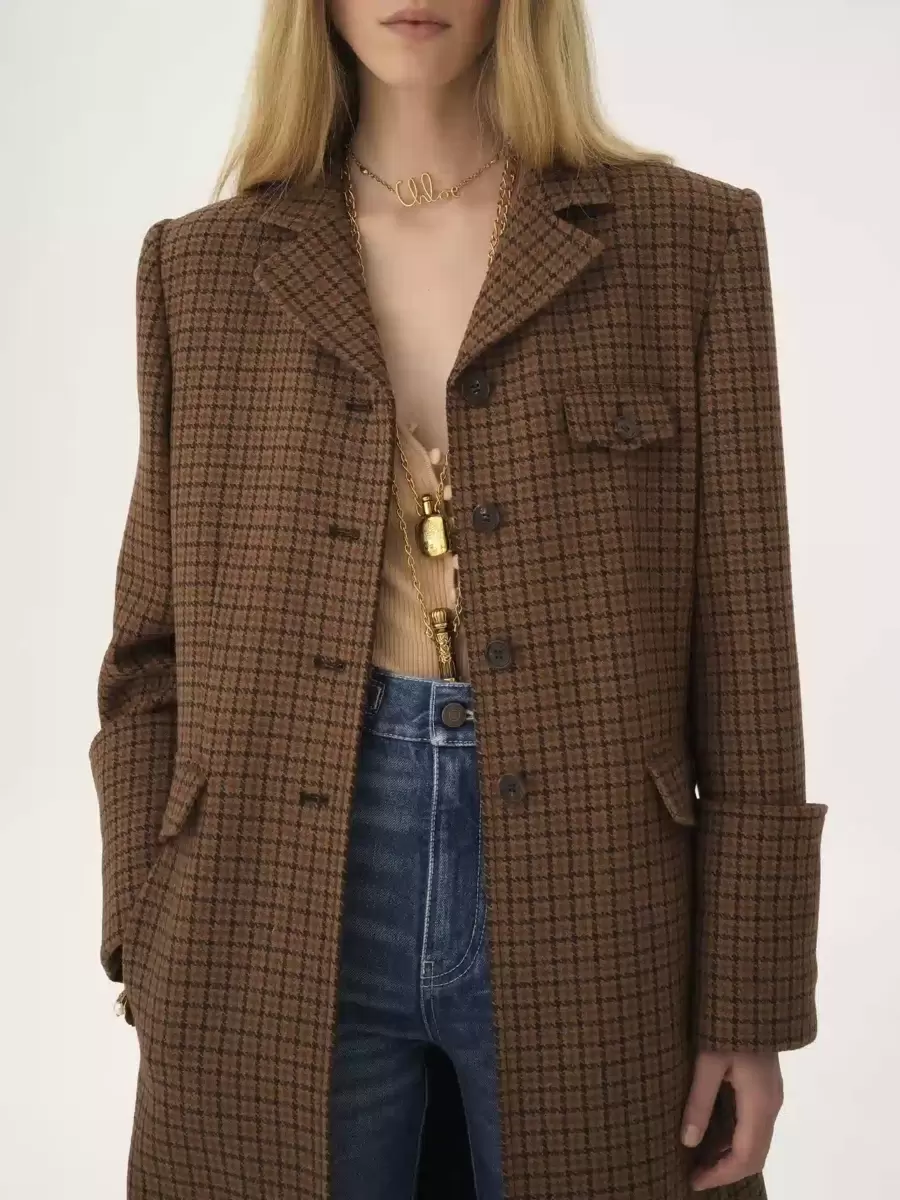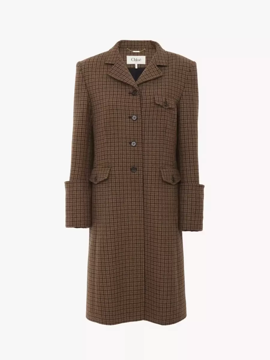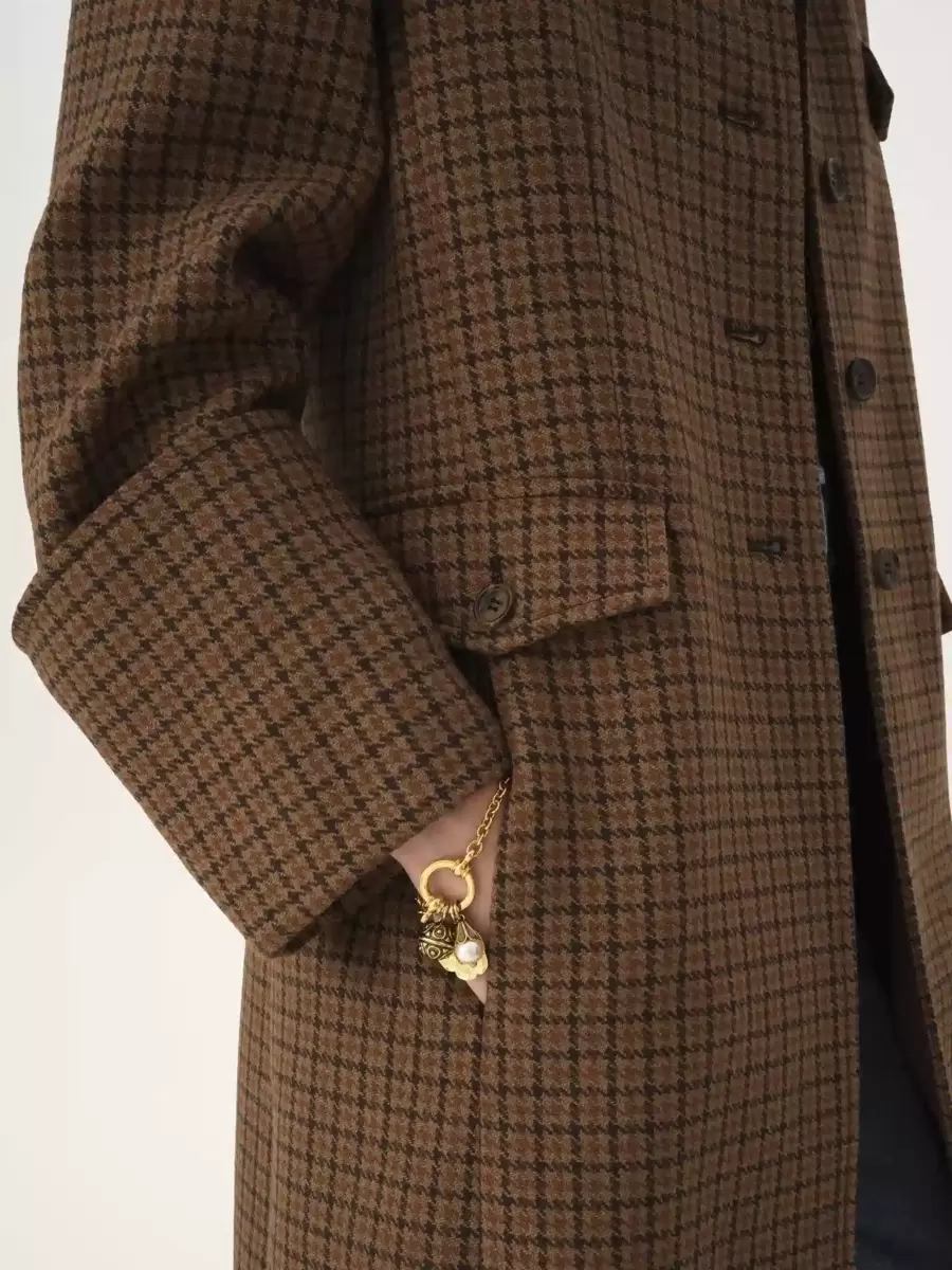 Cappotto da equitazione monopetto in lana pied de poule a basso impatto, con maxi polsini risvoltati, tasche con patta e bottoni in corno incisi.