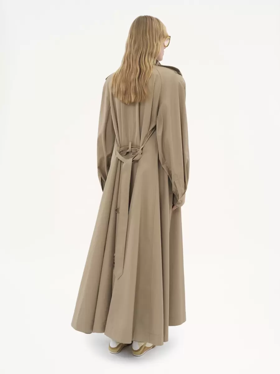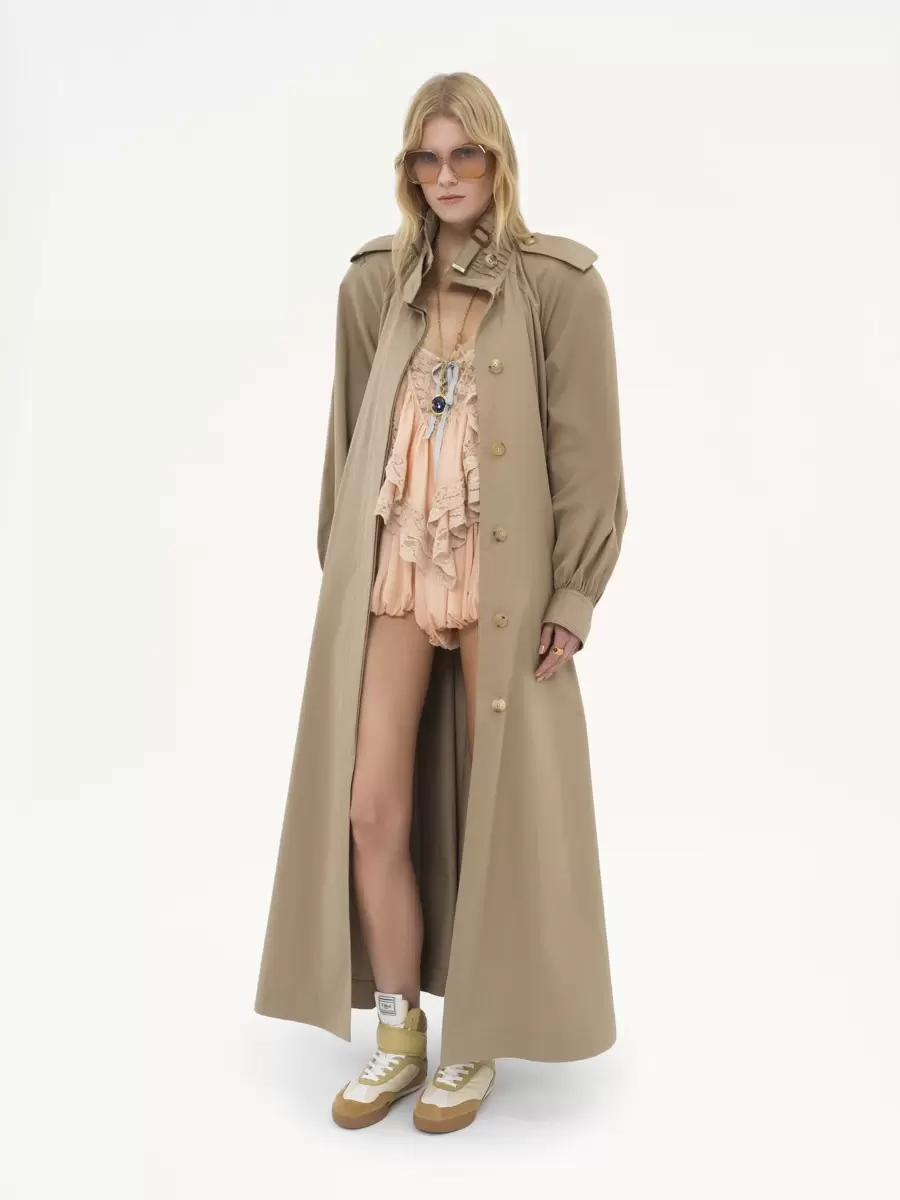 Trench lungo a collo alto in gabardine di cotone biologico leggero, con bottoni in corno incisi, cintura rimovibile e polsini arricciati. Fibbie in pelle e linguette sulle spalle completano questo capo.