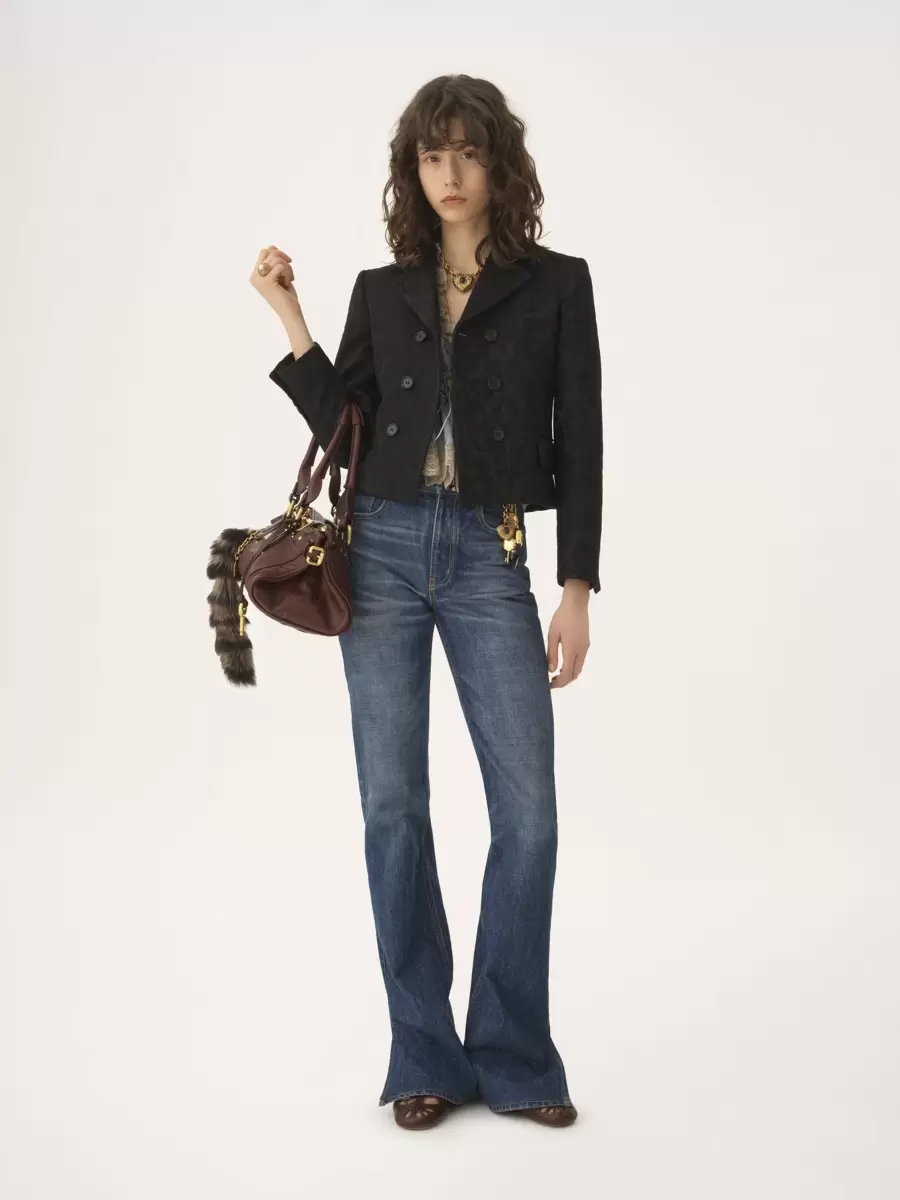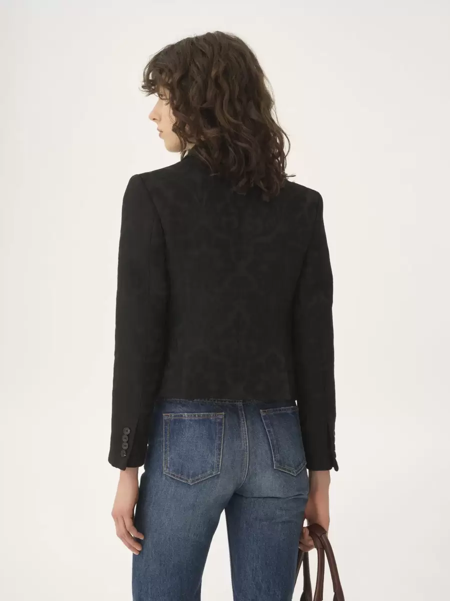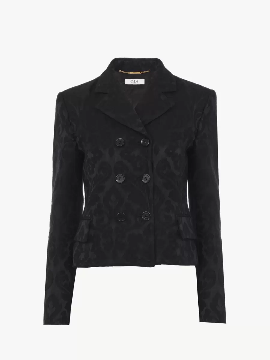 Giacca aderente doppiopetto in jacquard ornamentale misto lana con bottoni in corno incisi e tasche con patta.