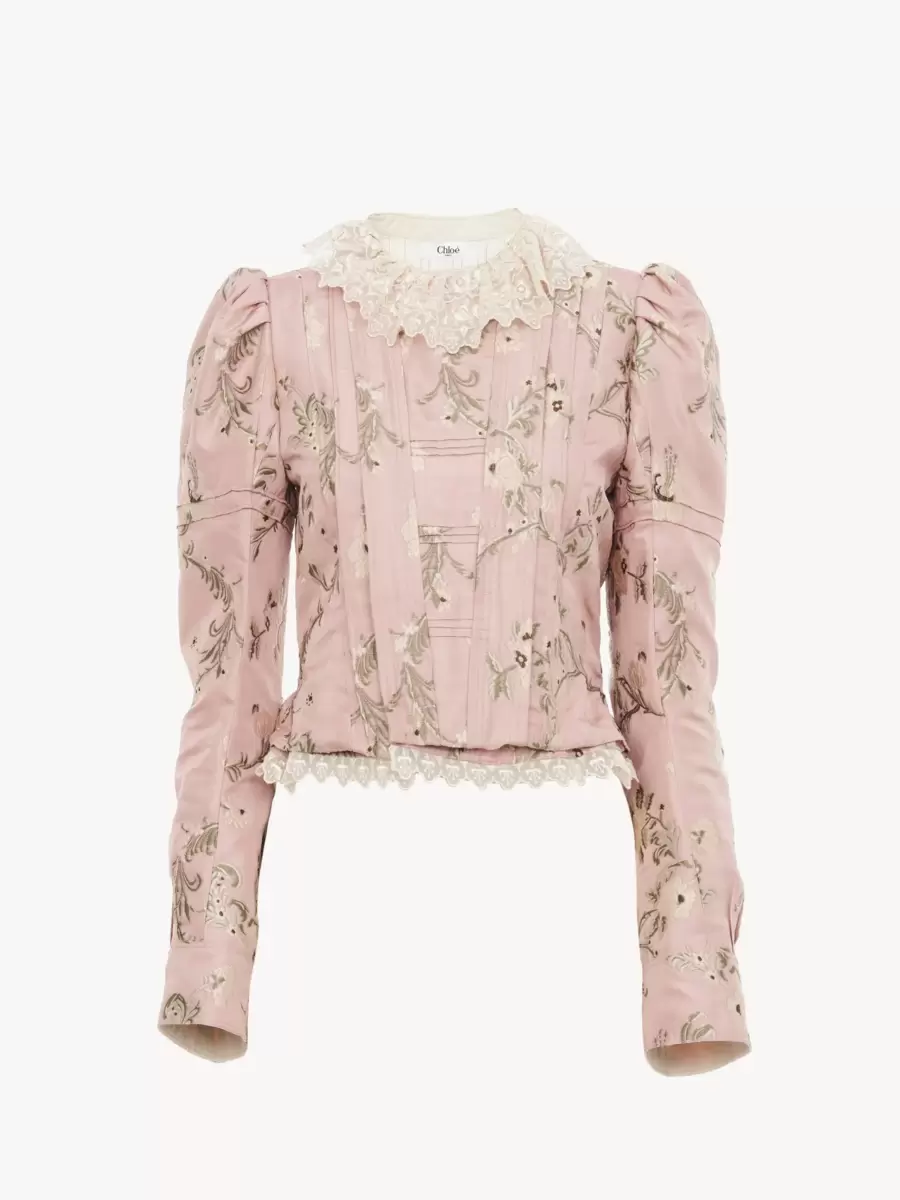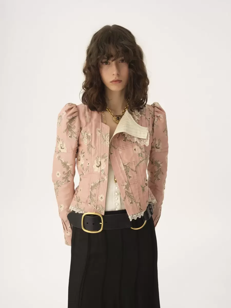 Giacca aderente barocca ricamata in taffetà misto seta jacquard floreale, con decorazioni in pizzo, spalle a sbuffo e chiusura con gancio.