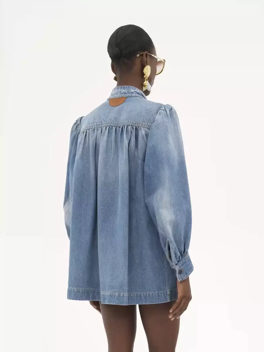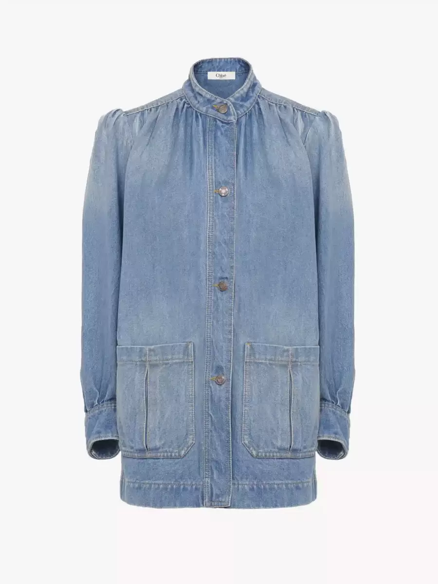 Giacca arricciata a collo alto in denim di cotone biologico effetto marmo chiaro, con maniche a sbuffo, maxi tasche applicate e bottoni in jeans con incisione Chloé.