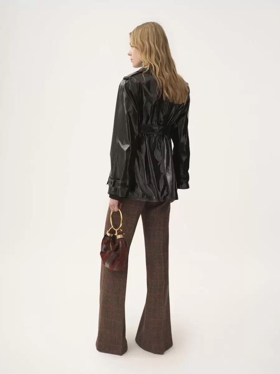 Giacca con cintura in cotone spalmato lucido, caratterizzata da maxi tasche con patta, bottoni in corno incisi e finiture dorate.