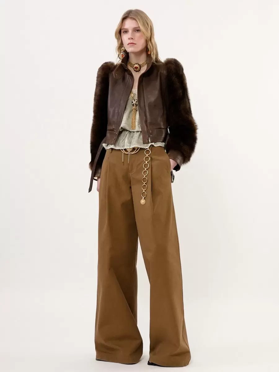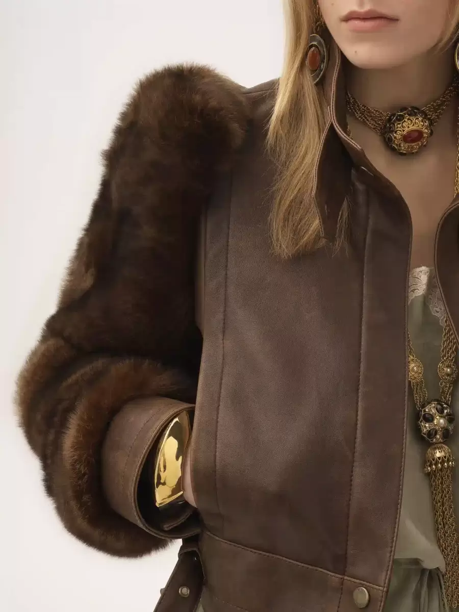 Giacca corta a collo alto in pelle di agnello vintage con maniche in shearling, cintura con fibbia e bottoni automatici spazzolati in oro con incisione Chloé.