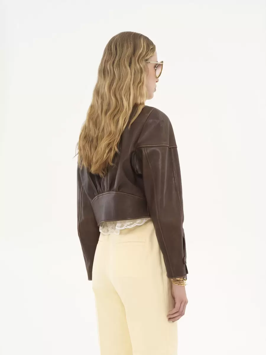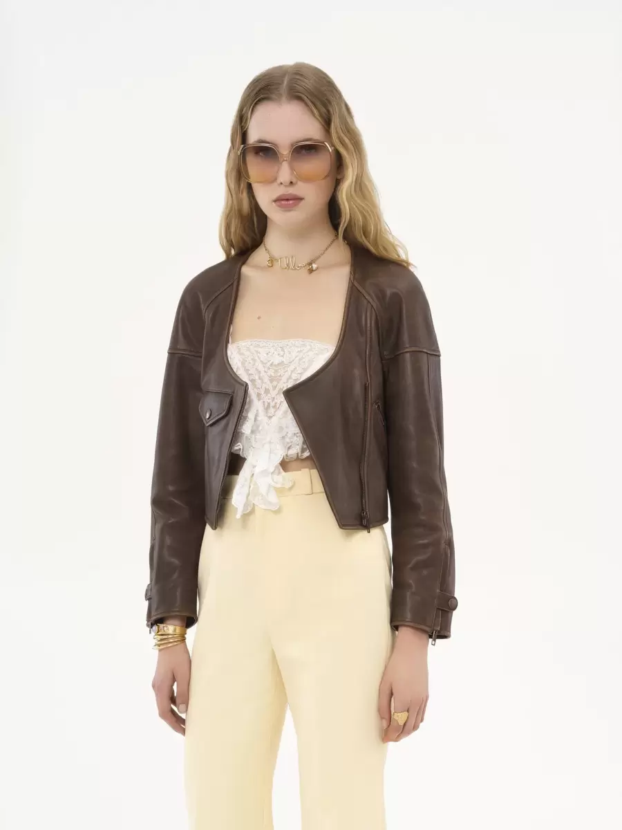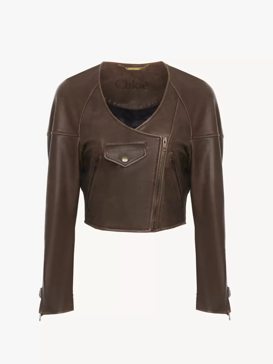 Giacca in pelle corta con finitura vintage, scollo rotondo, design asimmetrico con zip, schiena arricciata e tasche multiple.