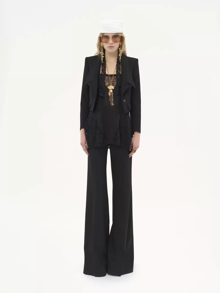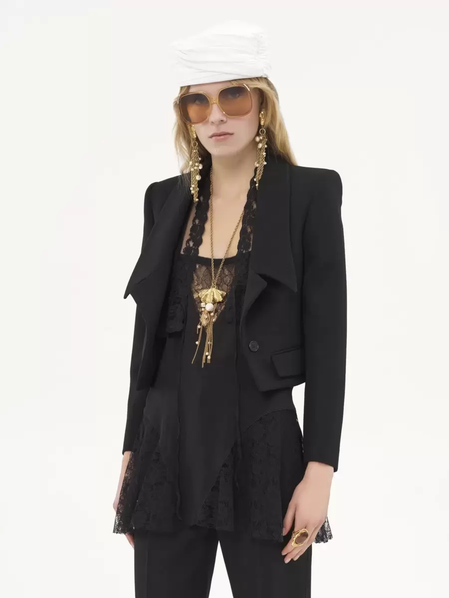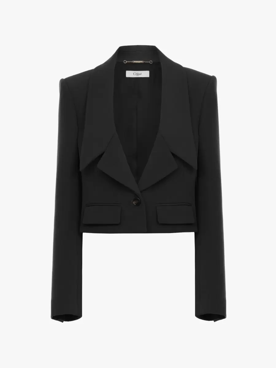 Giacca sartoriale corta in gabardine di lana a basso impatto, ispirata alla tradizione della Maison. Mini tasche con patta, revers oversize e bottoni in corno incisi completano questo capo.