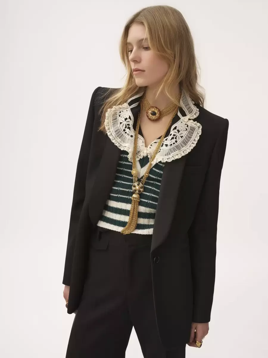 Giacca da smoking in lana grain de poudre a basso impatto con revers a scialle, rifinita con bottoni in corno incisi e tasche a filetto.