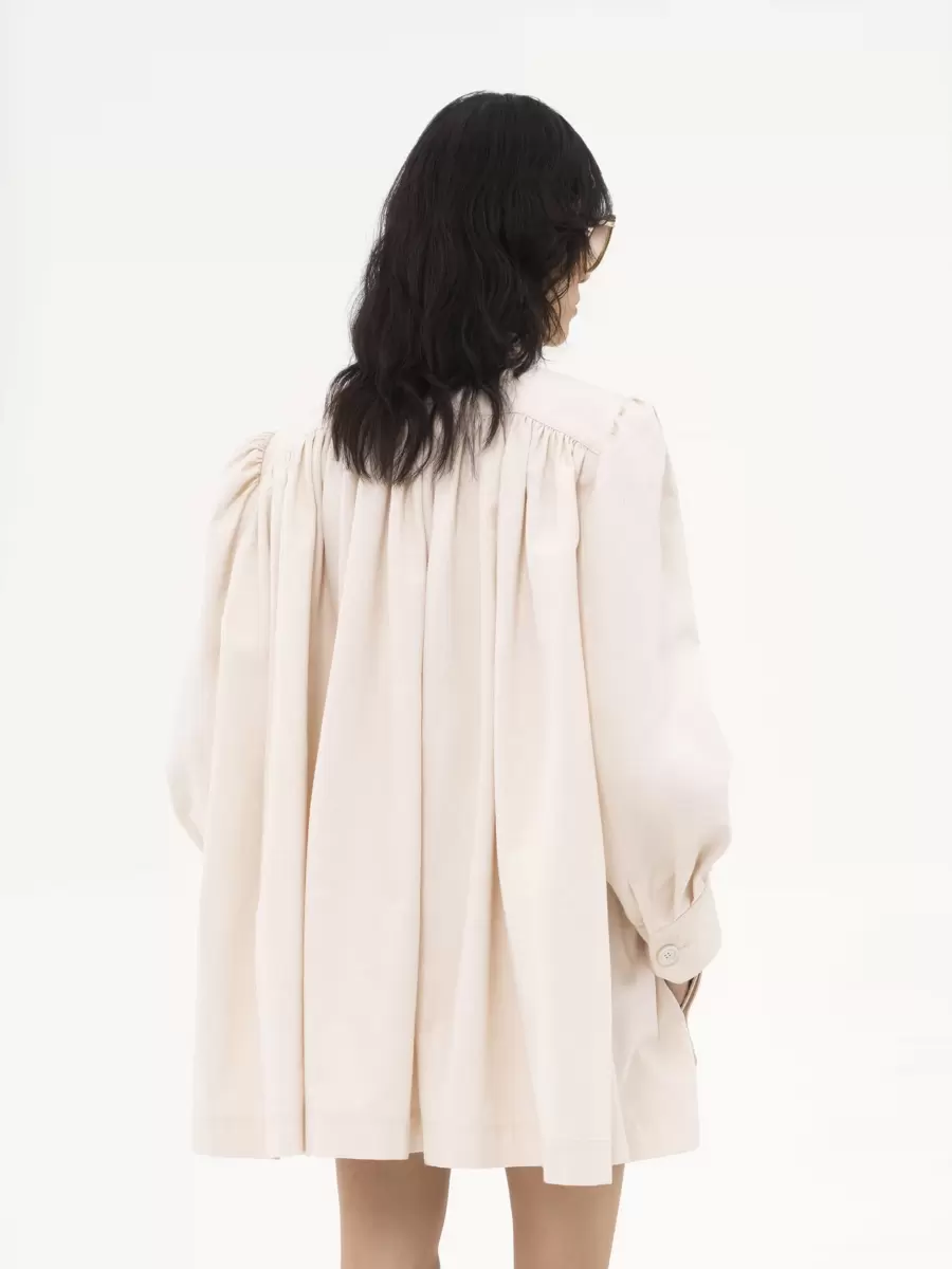 Giacca utilitaria con collo alto e arricciatura in tela di cotone a basso impatto, caratterizzata da maniche a sbuffo, maxi tasche con patta e bottoni in corno incisi. Un triangolo con logo Chloé in metallo dorato caratterizza la tasca sinistra.