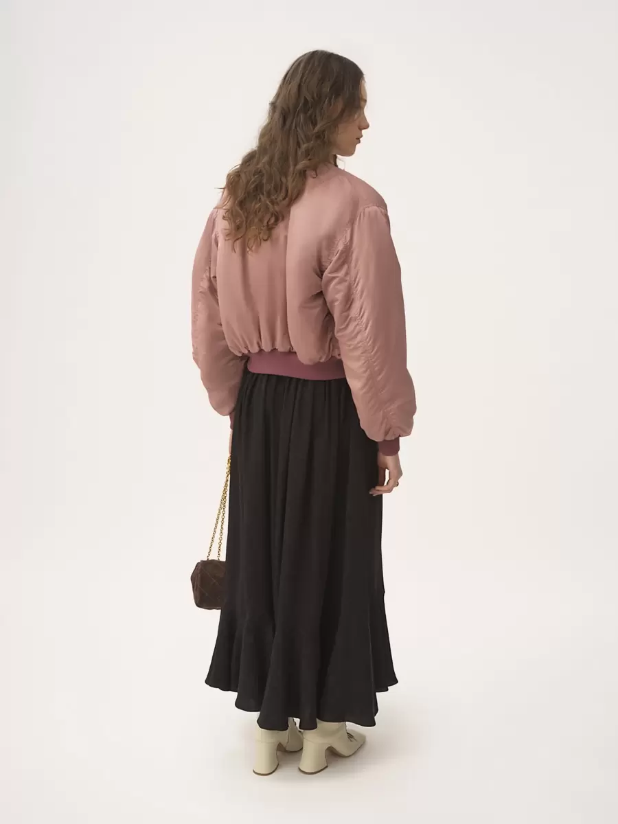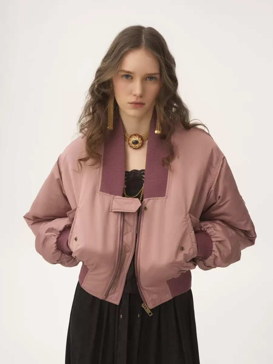 Bomber con collo alto in nylon con finiture a costine a contrasto, tasche con patta e bottone e tasca sulla manica con cerniera.