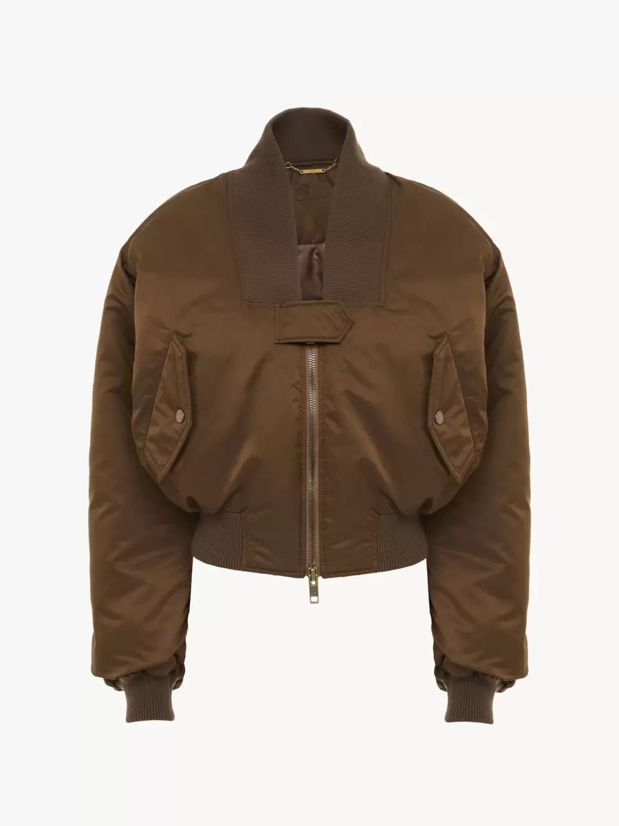Bomber in nylon con finiture a costine a contrasto su maxi collo, vita e polsini. Tasche con patta e bottoni automatici e una tasca sulla manica con cerniera completano questo capo.