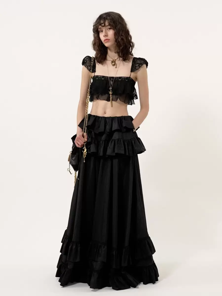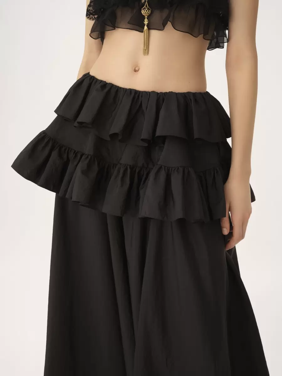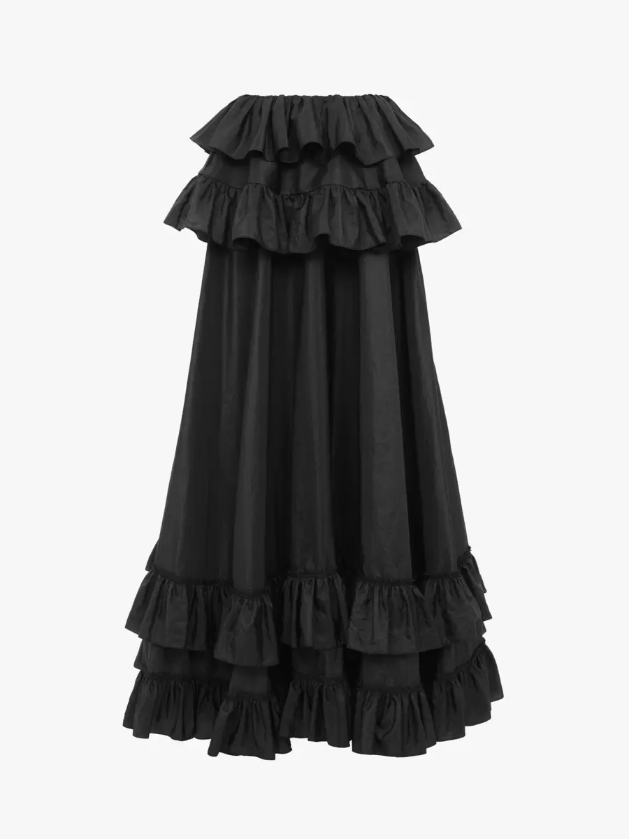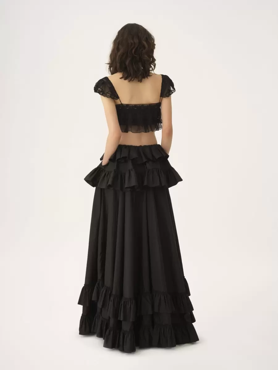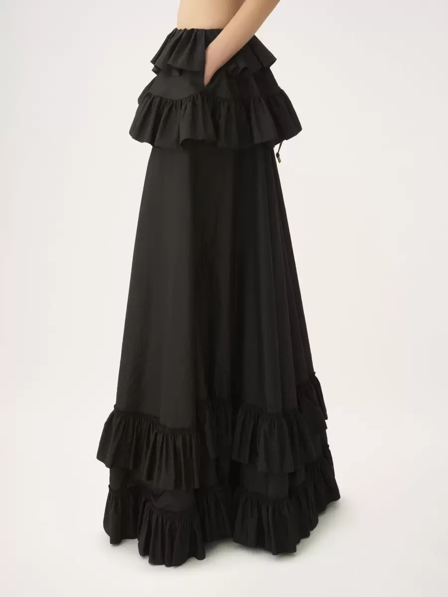 Gonna lunga a balze in taffetà di seta leggero lavato con fodera in misto seta, caratterizzata da generosi volant.