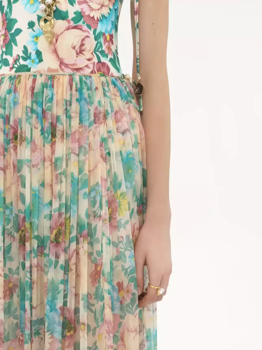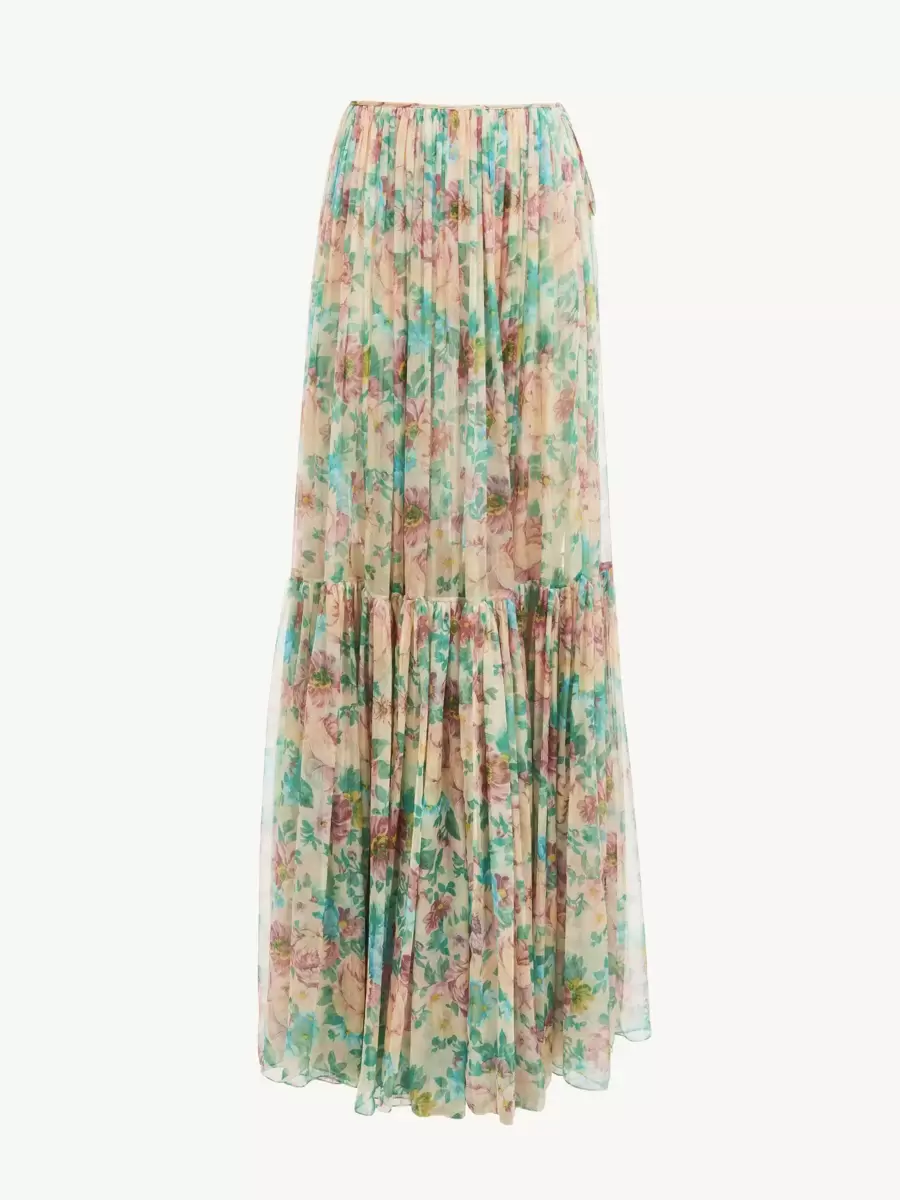 Gonna lunga arricciata in mousseline di seta organica con stampa floreale ispirata alla tradizione della Maison. La silhouette fluida e a strati include una fodera in misto seta, mentre un laccio laterale pendente con punte in metallo martellato completa questo capo.