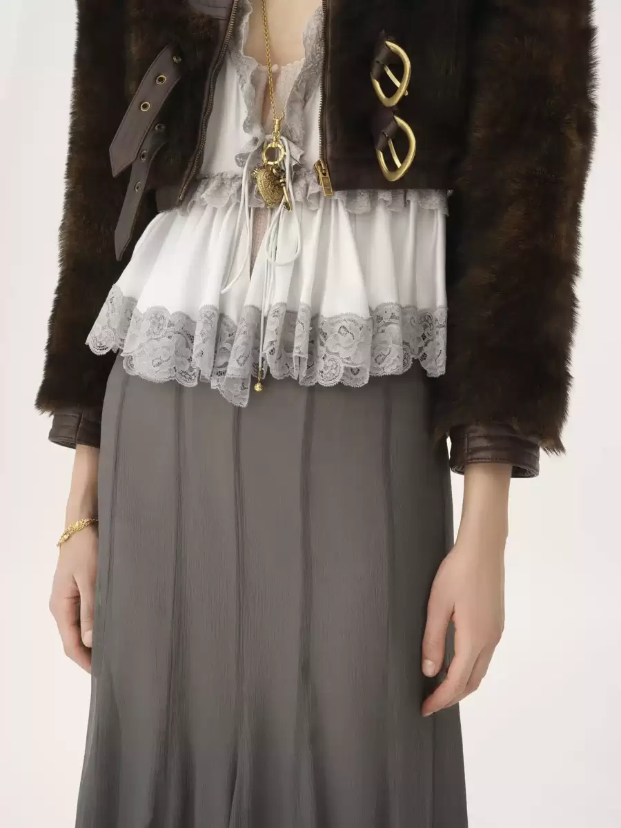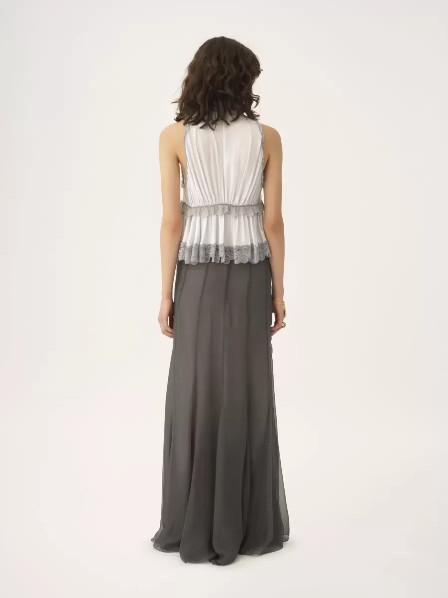 Gonna lunga fluida arricciata in mousseline di seta biologica con fodera in misto seta, rifinita con balze.