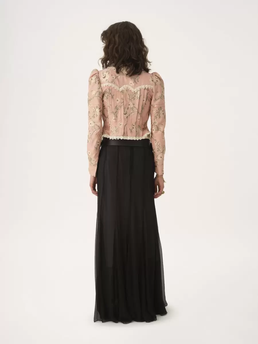 Gonna lunga fluida arricciata in mousseline di seta biologica con fodera in misto seta, rifinita con balze.
