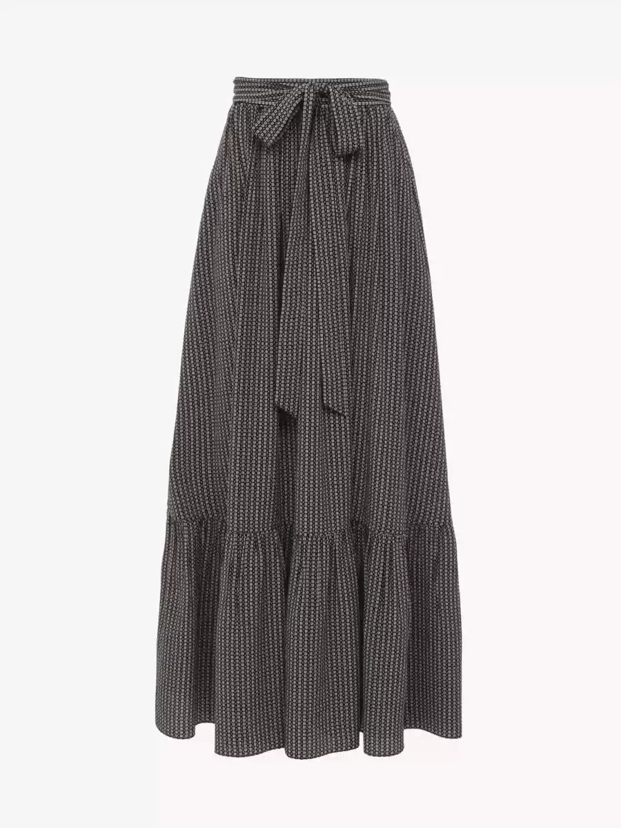 Gonna midi arricciata in crêpe de chine di seta biologica con stampa grafica. La silhouette fluida e a strati presenta una cintura in tessuto annodata in vita.