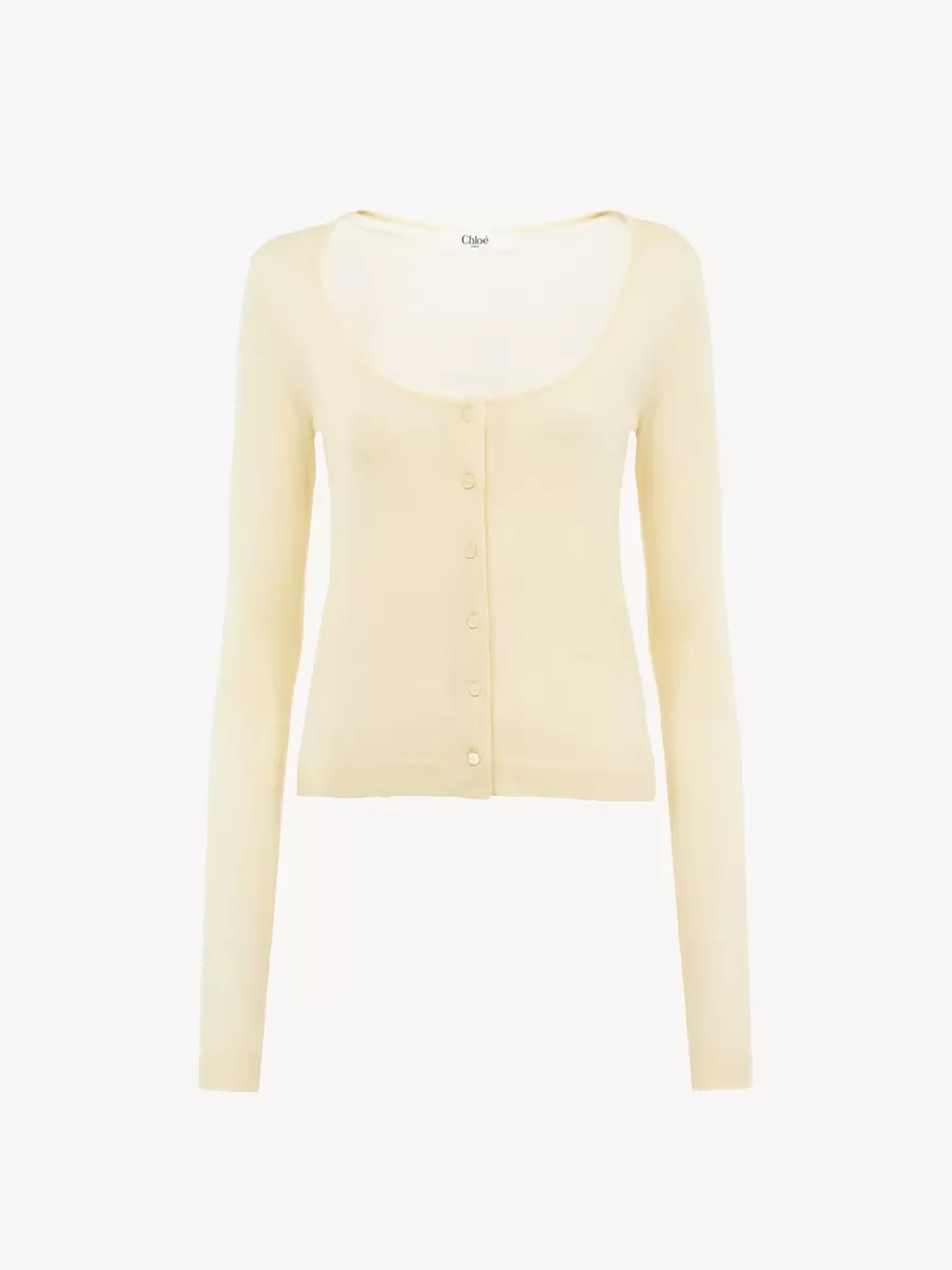 Cardigan aderente con scollo a barchetta in maglia di lana superfine a coste a basso impatto, con bottoni in madreperla sul davanti e ricamo del logo Chloé tono su tono sul fianco sinistro.