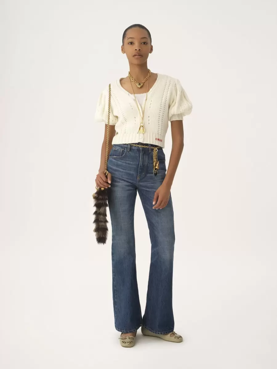 Cardigan con scollo a V in maglia di lana e cashmere spessa e a basso impatto, con maniche corte a sbuffo, bottoni ricoperti in tessuto e ricamo del logo Chloé sull’orlo.