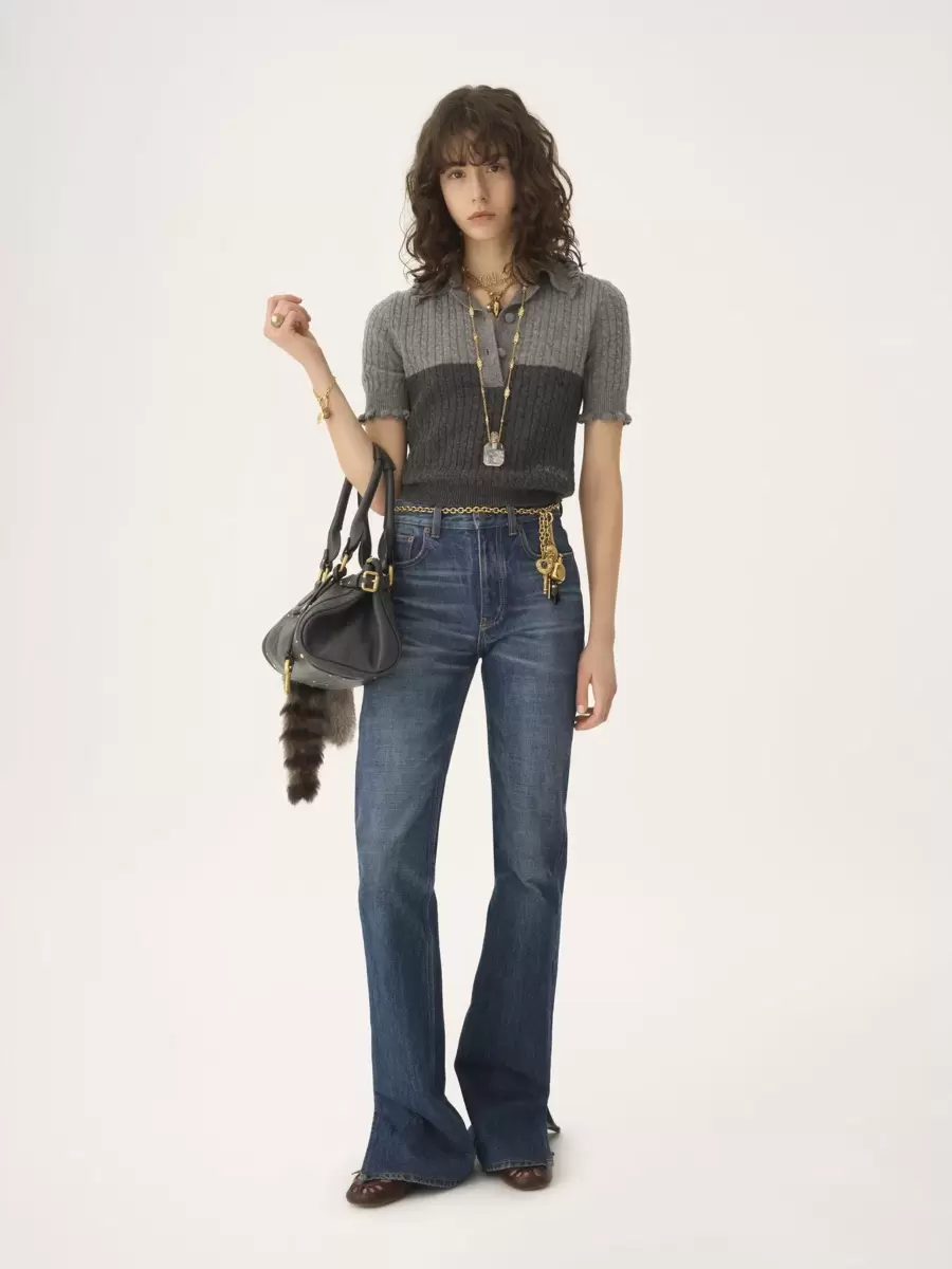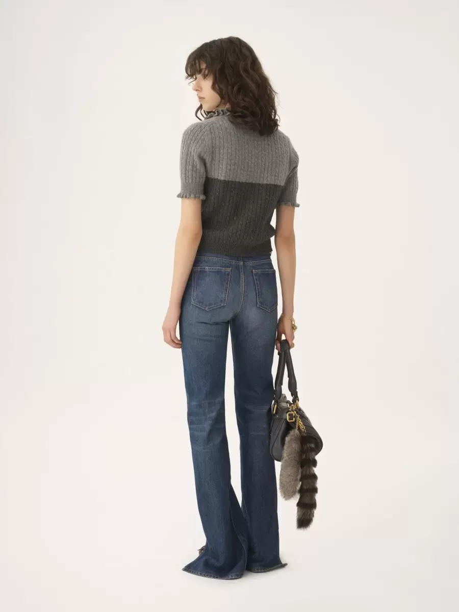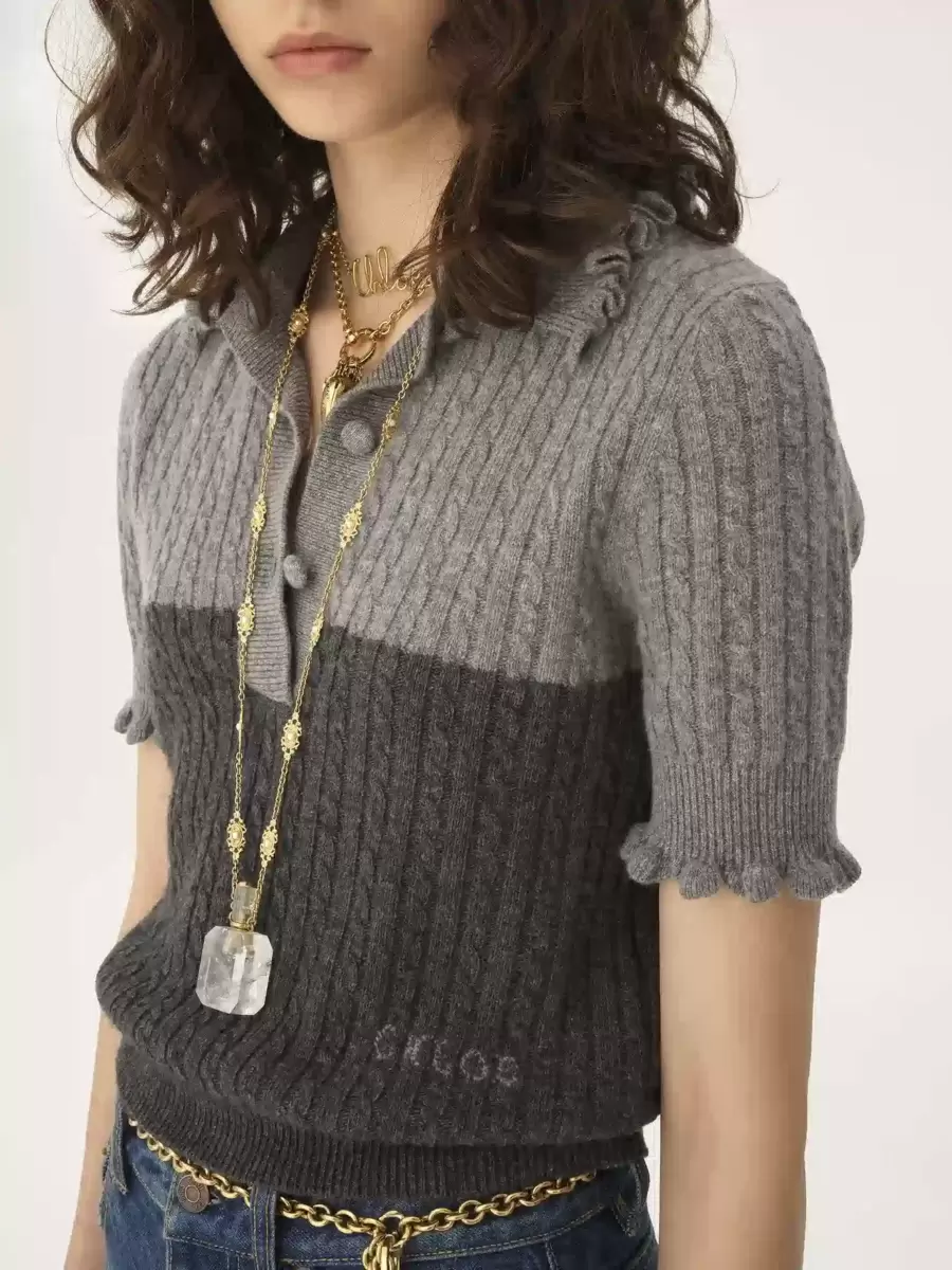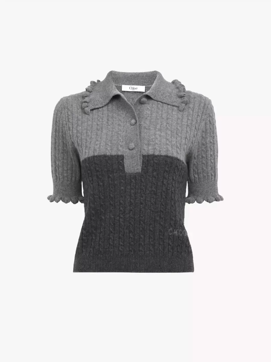 Maglione polo bicolore a maniche corte in maglia di lana e cashmere a basso impatto, con volant, bottoni ricoperti in tessuto e ricamo del logo Chloé sul fianco.