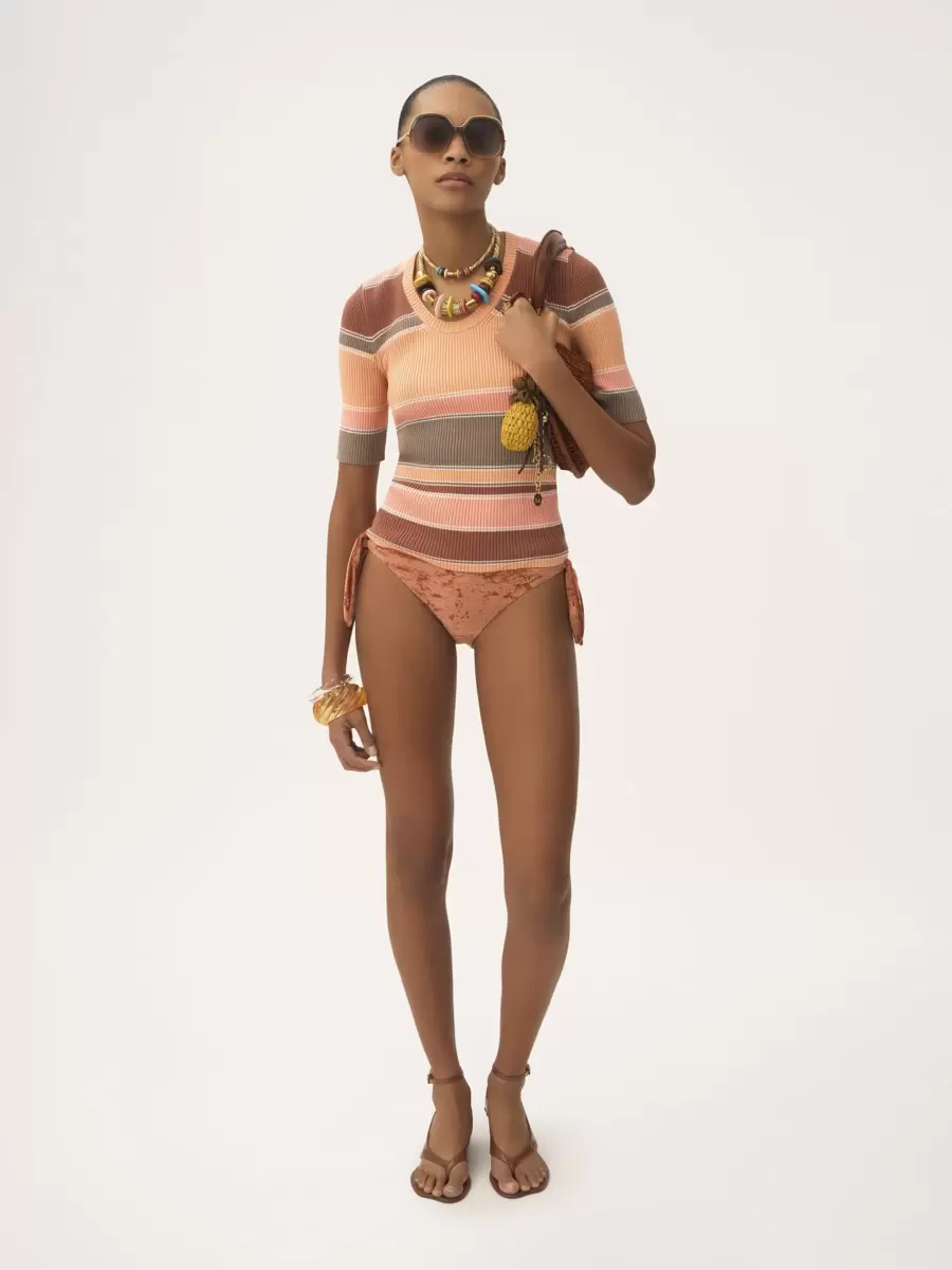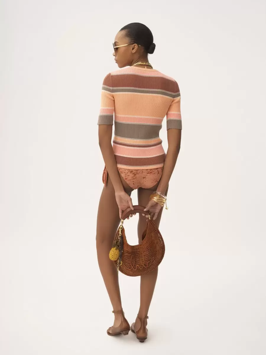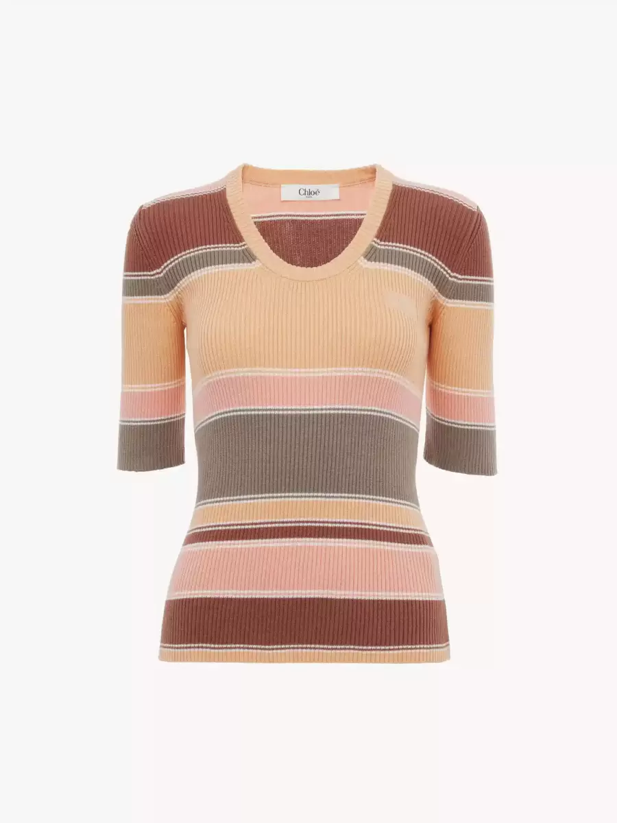 Top aderente con scollo a barchetta e maniche al gomito in maglia a coste a righe, caratterizzato da un discreto ricamo del logo Chloé sul petto.
