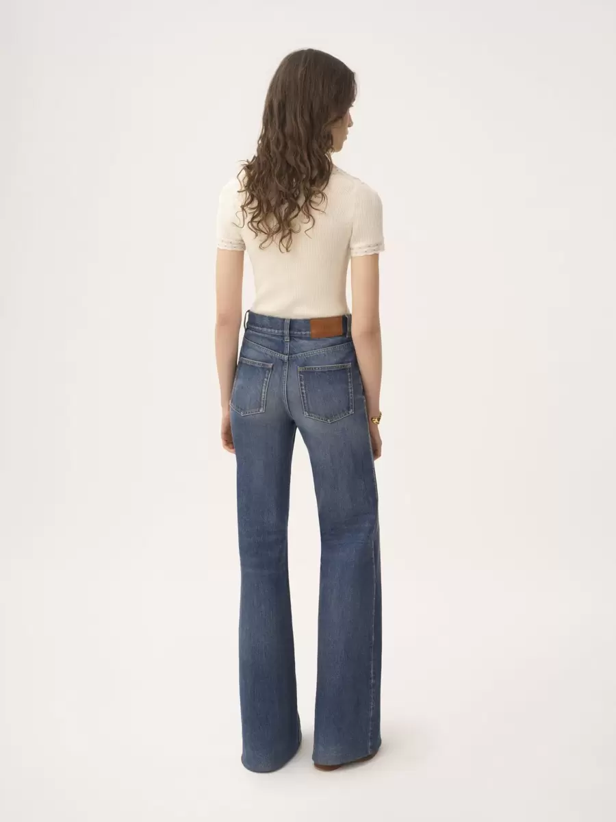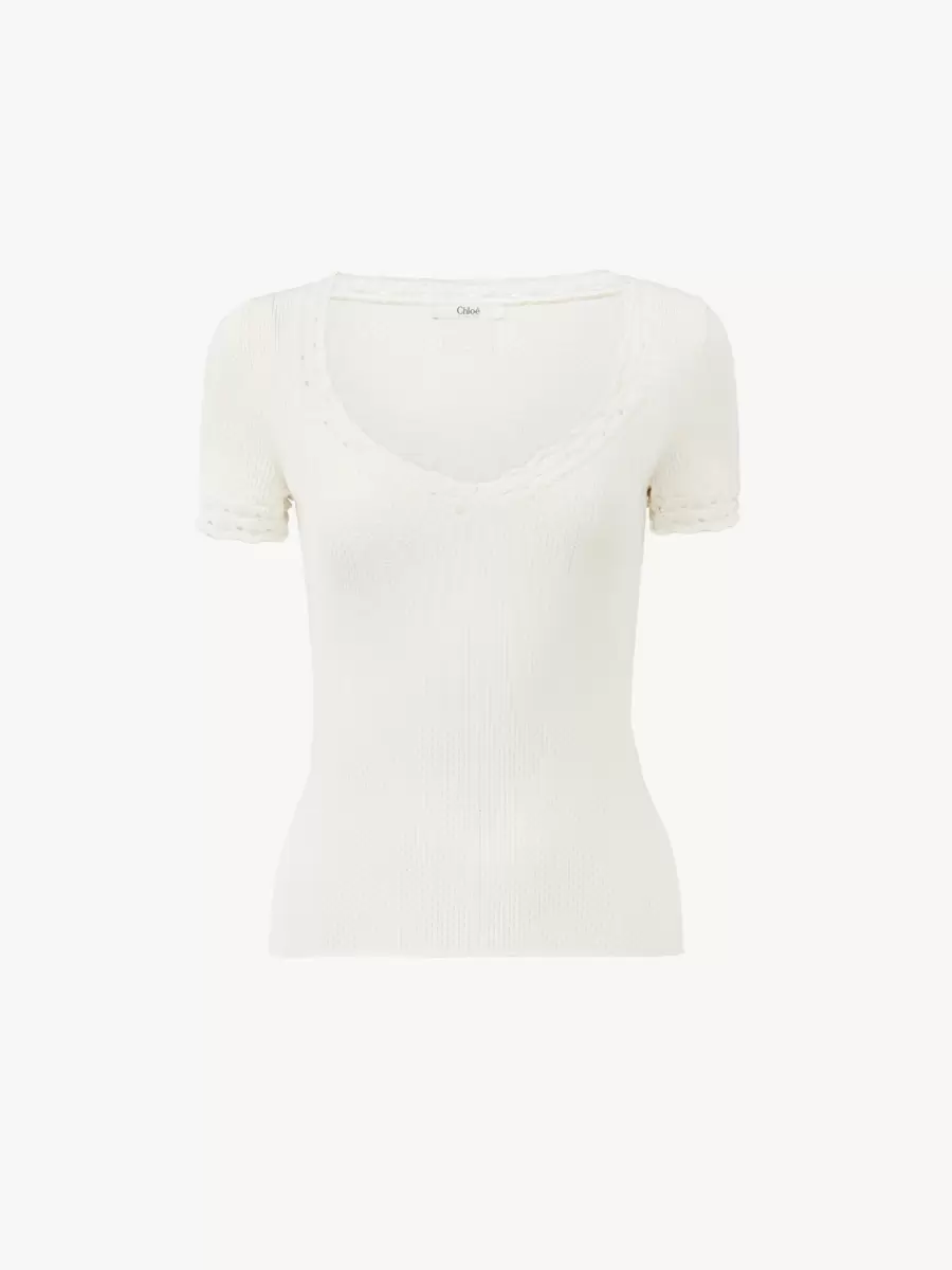 Top aderente con scollo a barchetta in maglia di lana traforata a basso impatto con finiture in pizzo e una discreta toppa con logo Chloé sul retro.