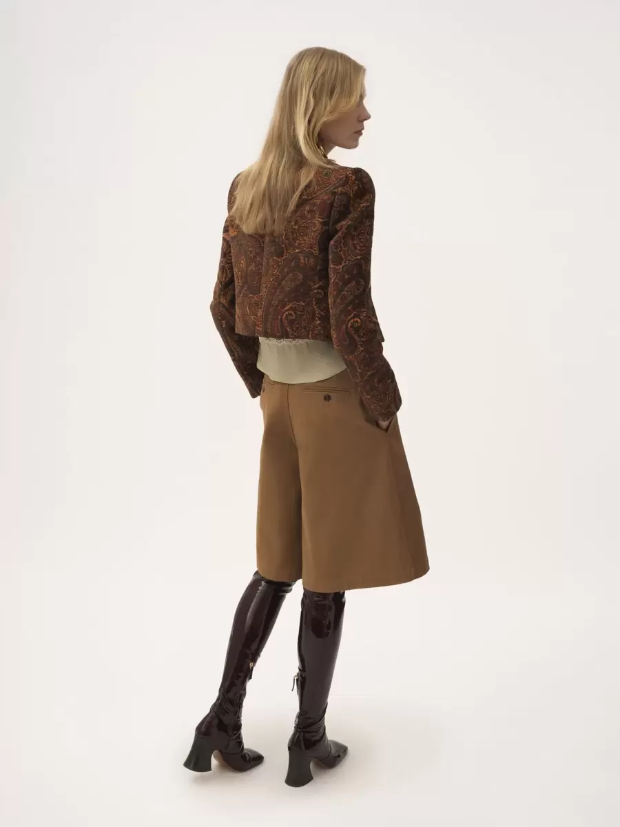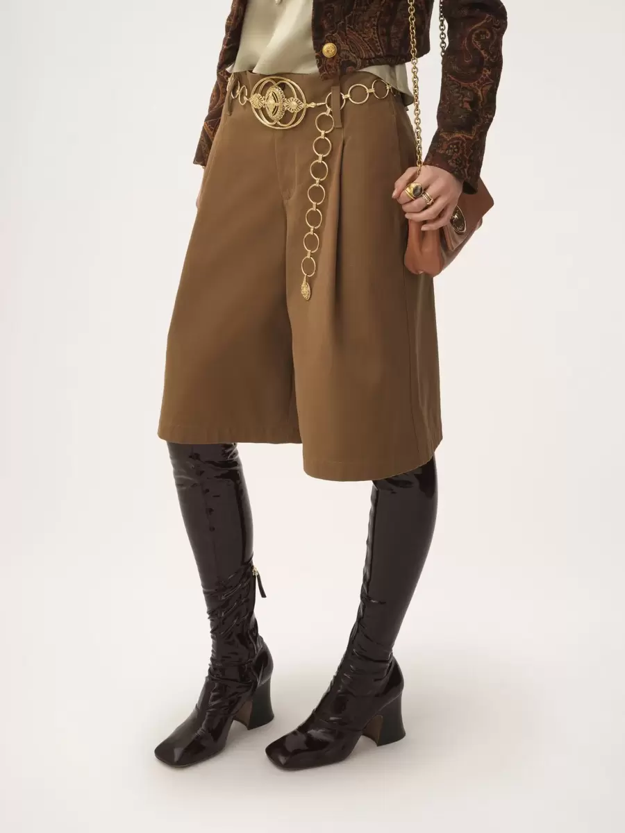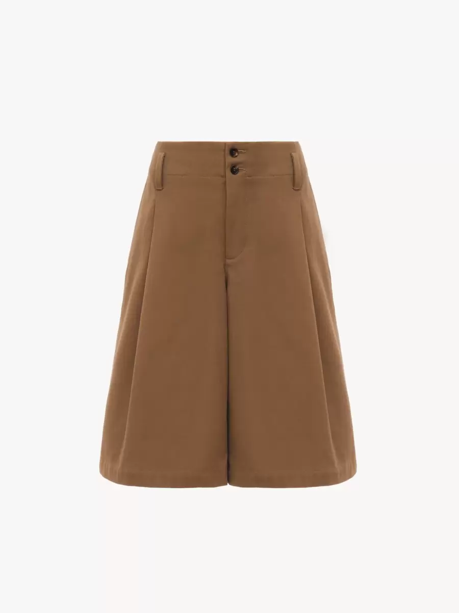 Bermuda a vita alta e gamba larga in tela di cotone biologico tinto in capo, con pieghe anteriori e bottoni in corno incisi.