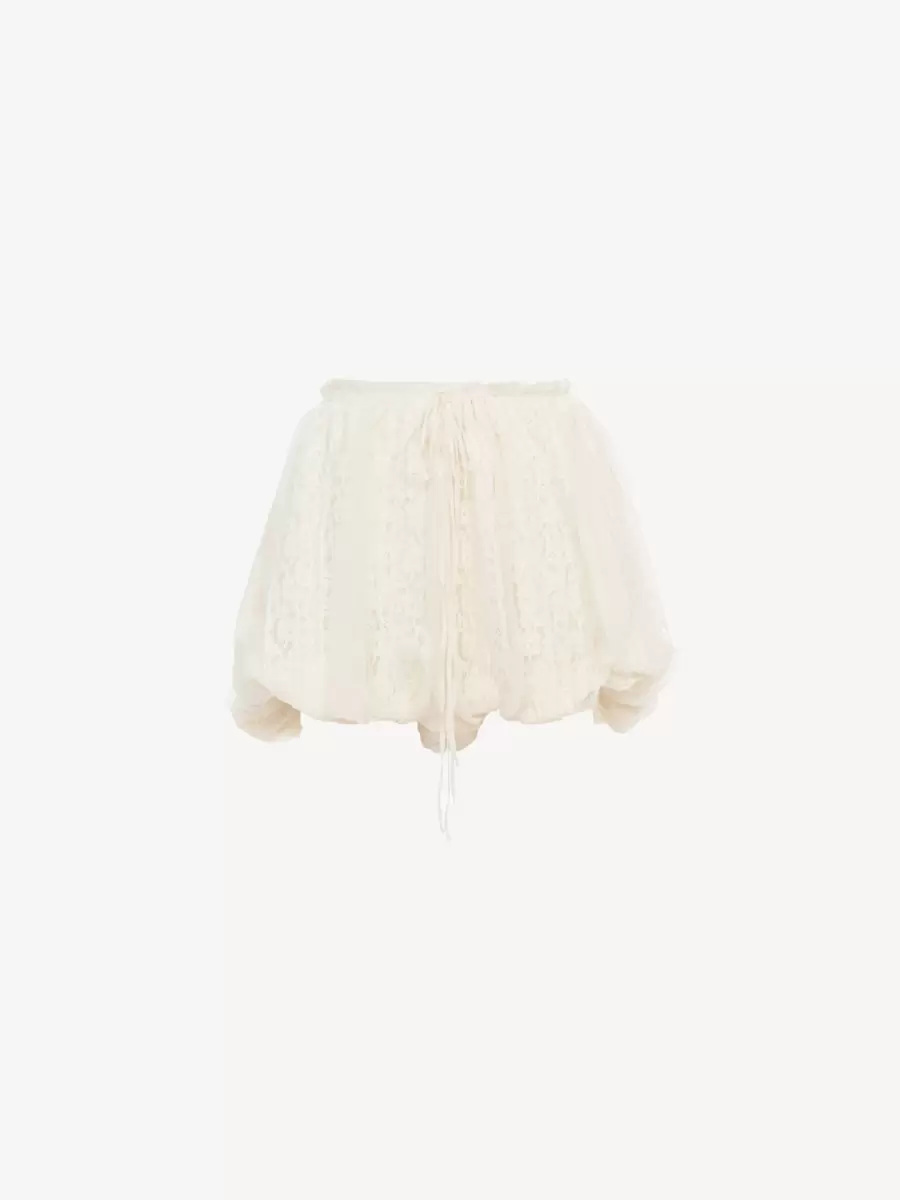 Mini shorts a campana fluidi e arricciati in mousseline di seta biologica con decorazioni in pizzo floreale e fodera in misto seta. La coulisse in vita è dotata di lacci pendenti rifiniti con punte color oro.