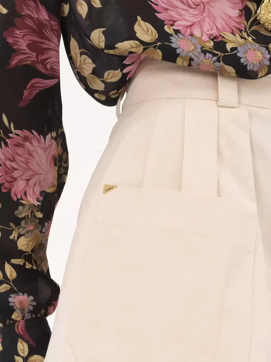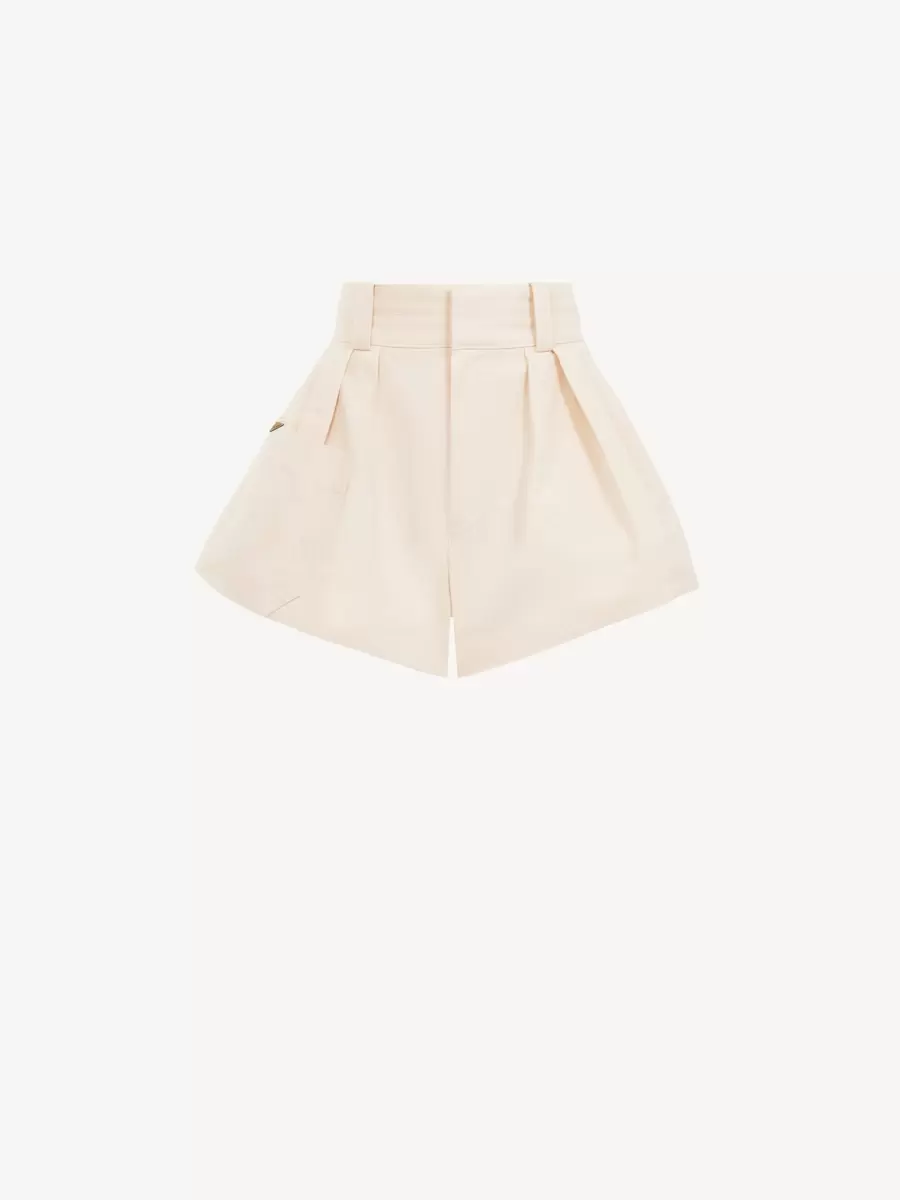 Mini shorts a vita alta in tela di cotone biologico tinto in capo con pieghe e tasca anteriore asimmetrica applicata con triangolo con logo Chloé in metallo dorato.