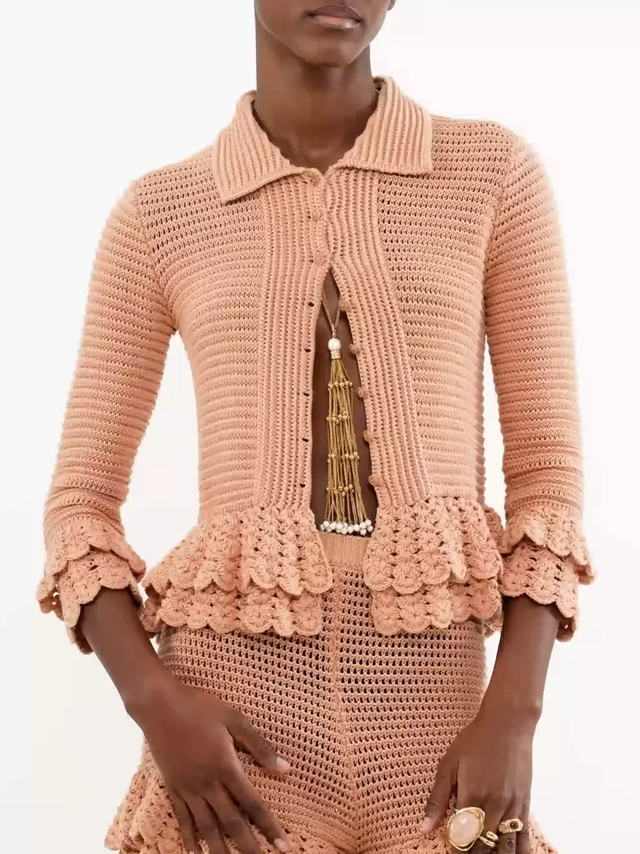 Mini shorts aderenti con volant in maglia all’uncinetto, con volant a strati sull’orlo.