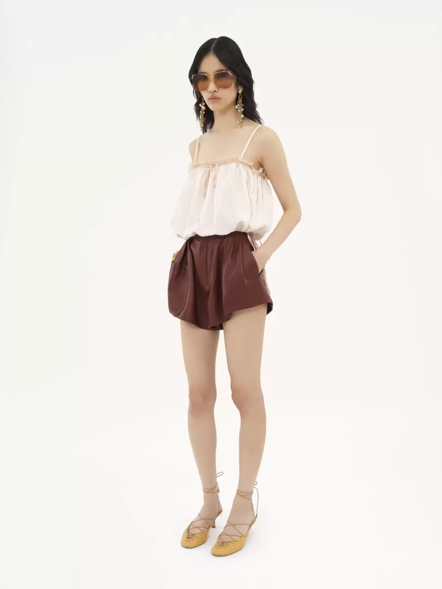 Shorts a vita alta in nappa plongé, caratterizzati da una silhouette arricciata e una maxi tasca applicata sul davanti. Un triangolo con logo Chloé in metallo dorato completa questi shorts in pelle.