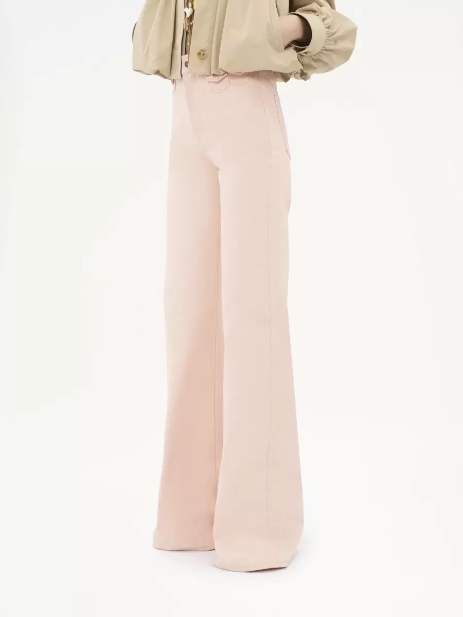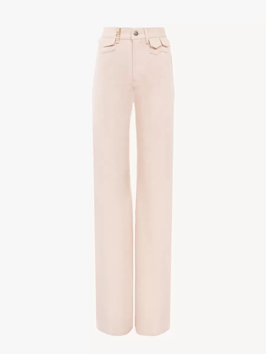 Jeans a zampa a vita alta in denim di cotone biologico tinto in capo con mini tasche con patta in vita.
