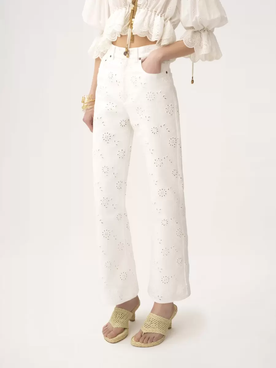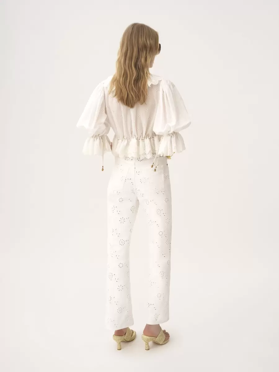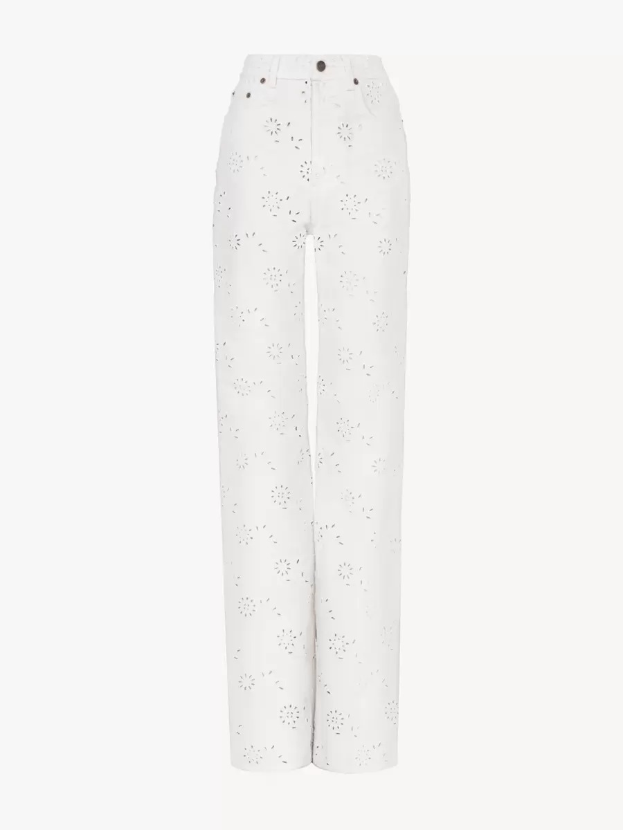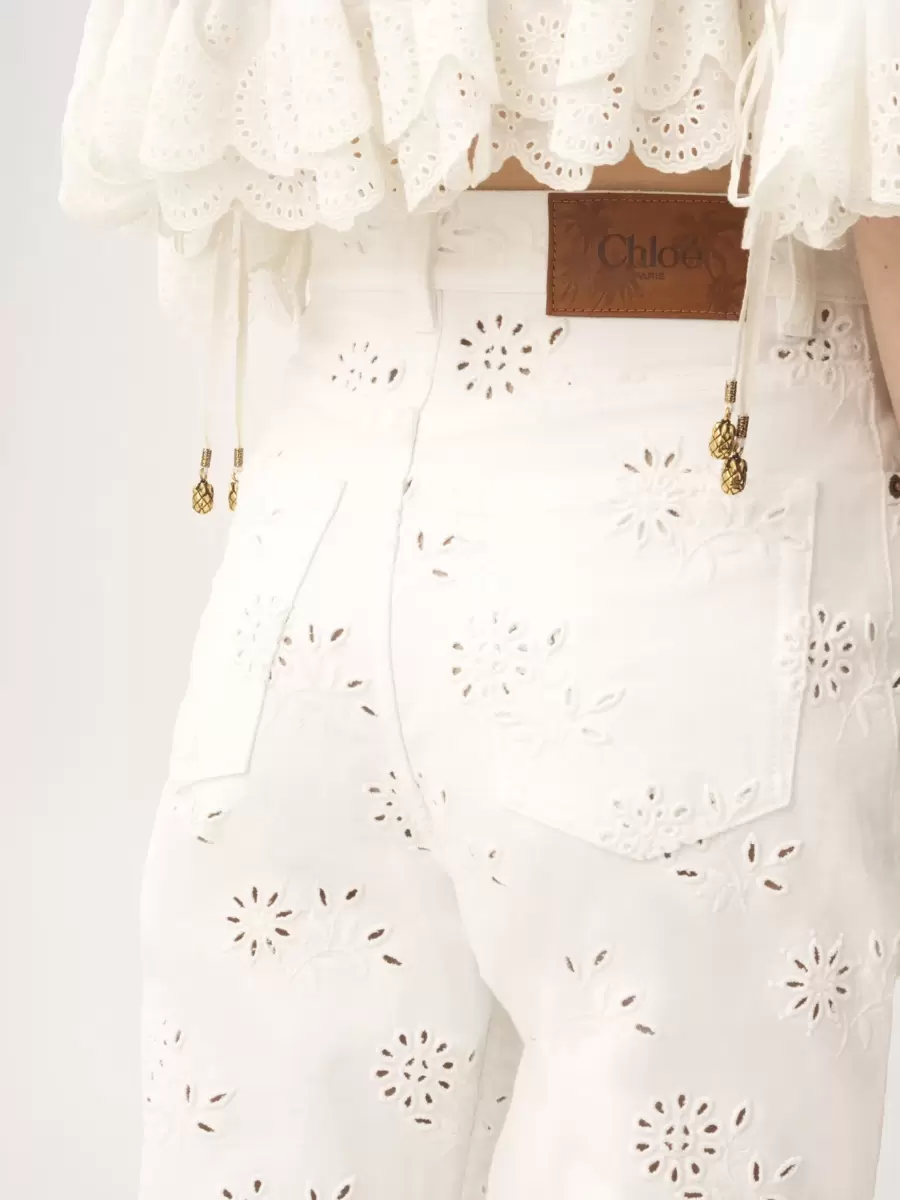 Jeans cropped in denim di cotone biologico con ricamo inglese floreale all-over.