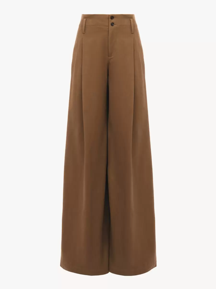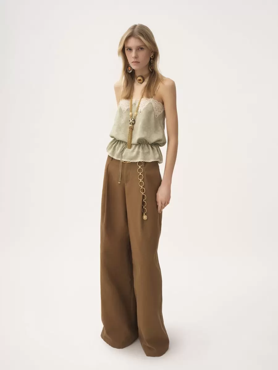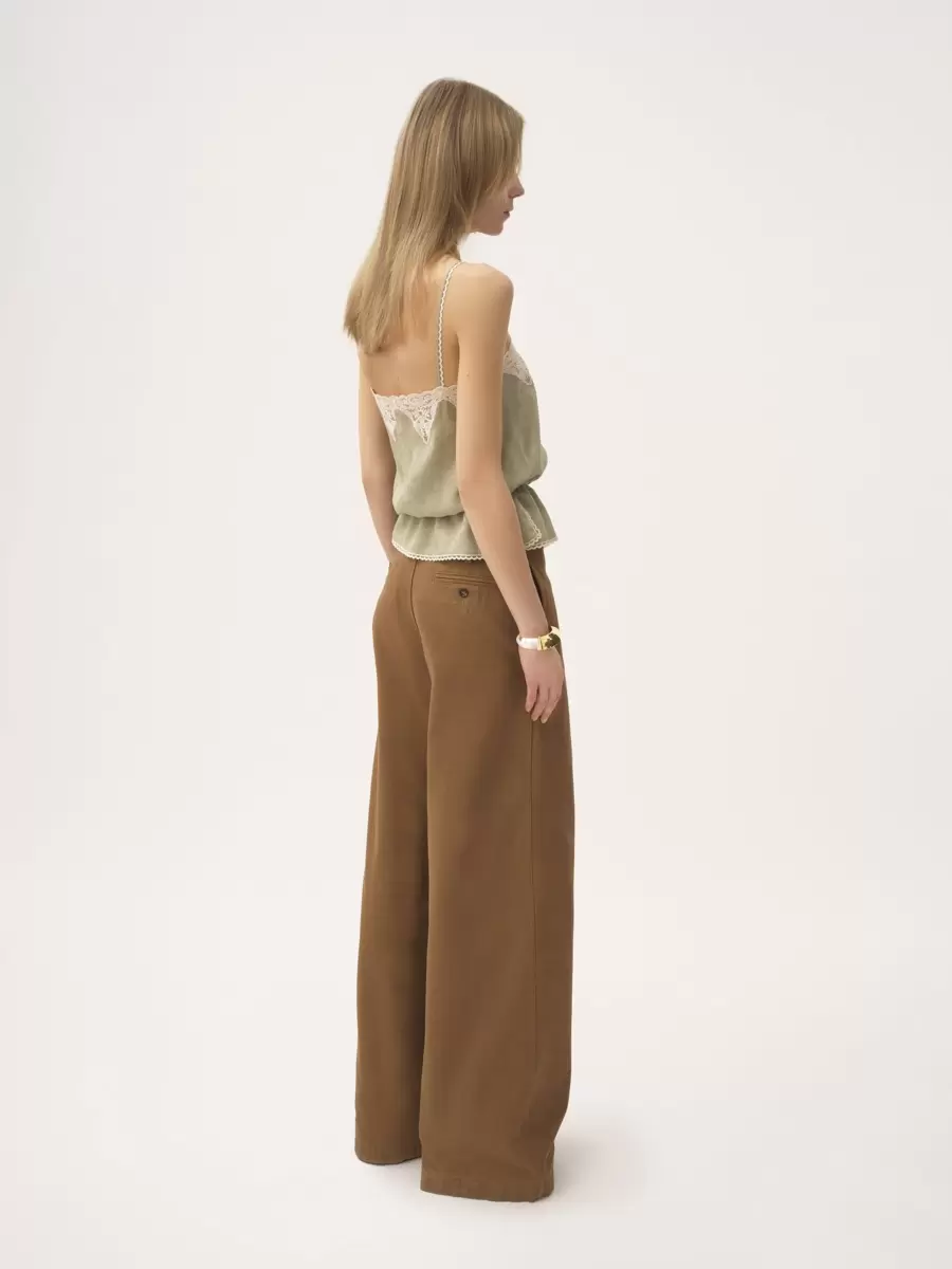 Pantaloni a vita alta e gamba larga in tela di cotone tinta in capo, con pieghe anteriori e bottoni in corno incisi.