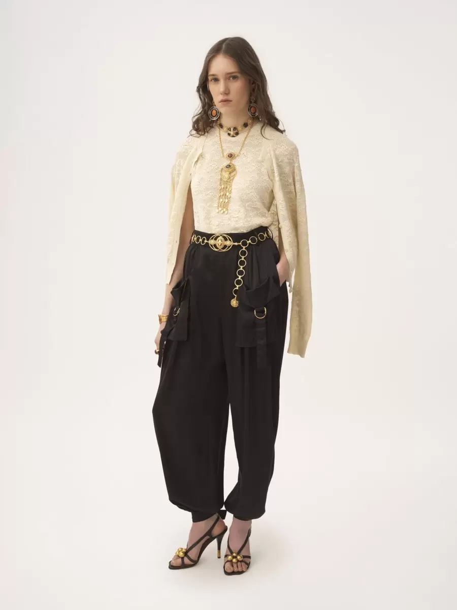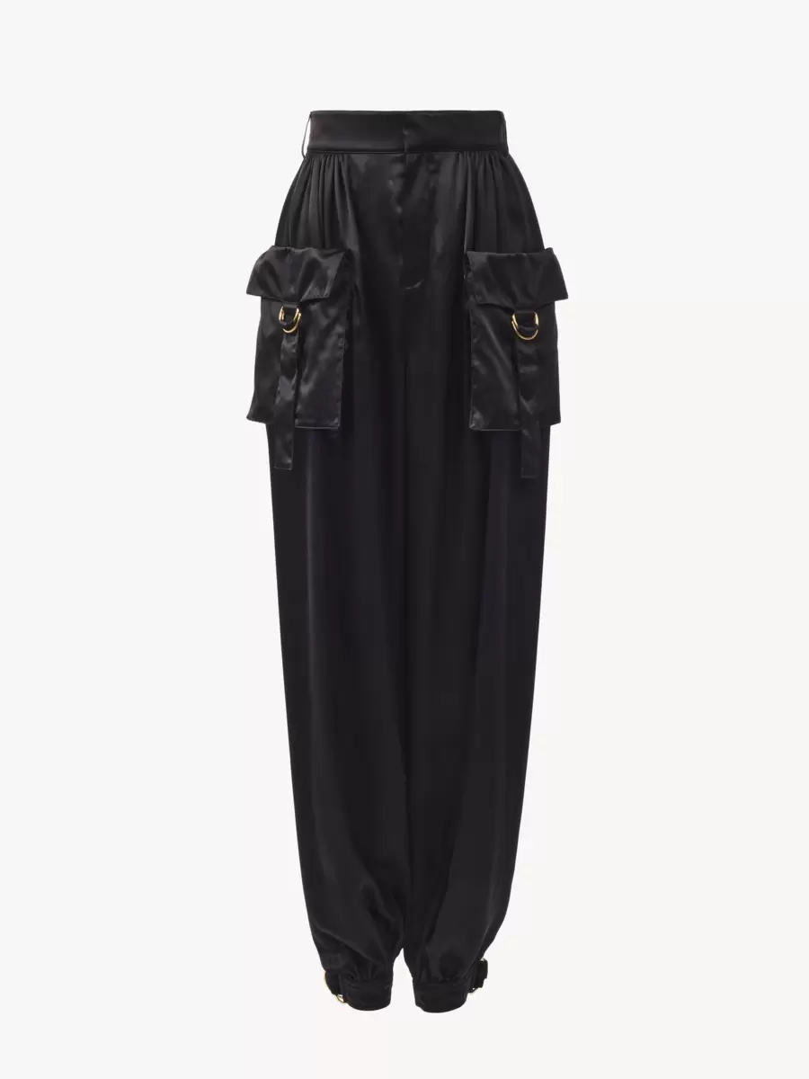 Pantaloni cargo fluidi in raso di seta, con tasche oversize con patta sul davanti. Anelli a D color oro impreziosiscono le tasche e le linguette dei polsini affusolate.