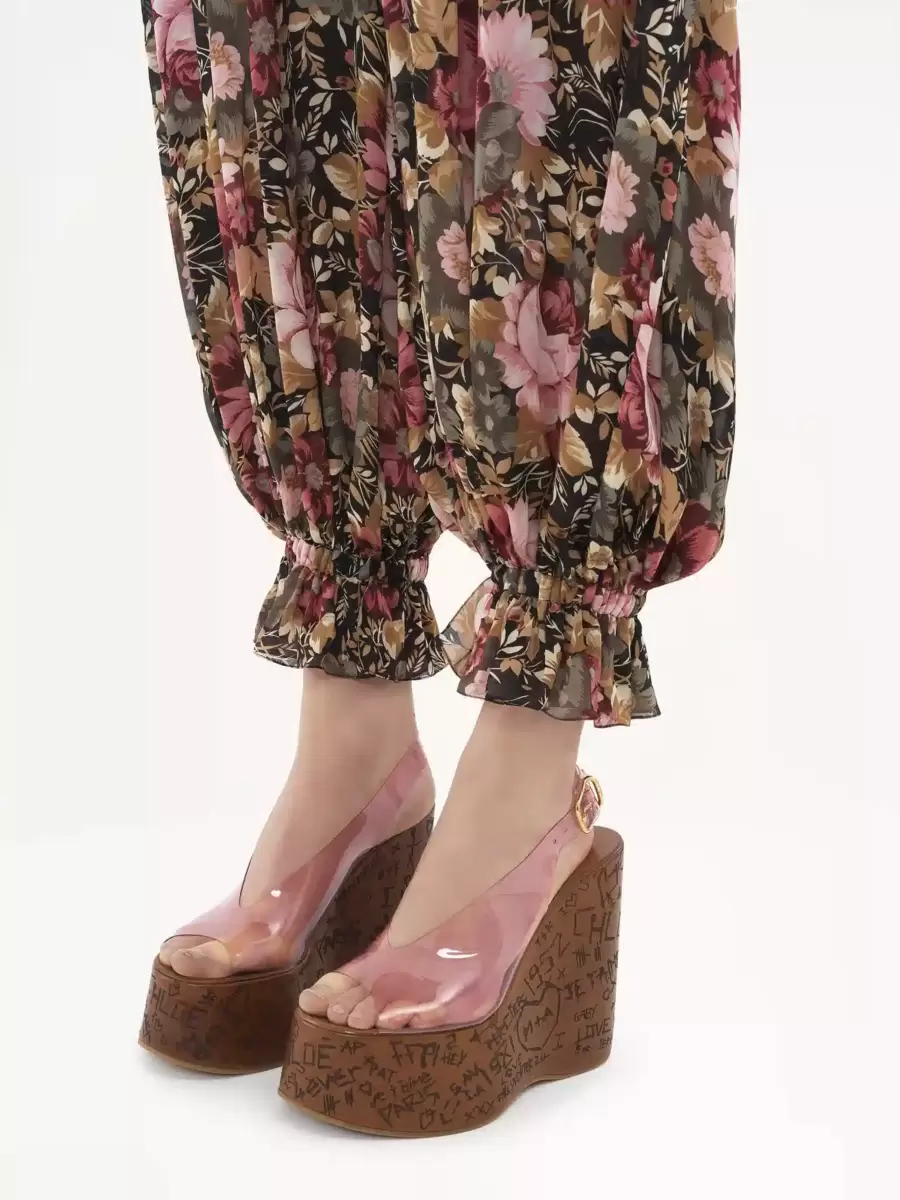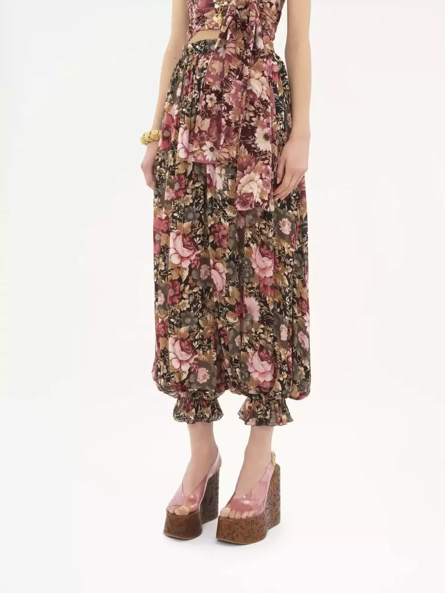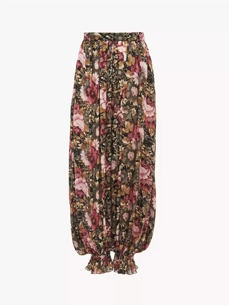 Pantaloni fluidi con pieghe in charmeuse di seta organica con stampa di rose ispirata alla tradizione della Maison. La silhouette corta è arricciata alle caviglie elasticizzate, impreziosite da bottoni rivestiti in tessuto. Un anello a D color oro segna il fianco destro.