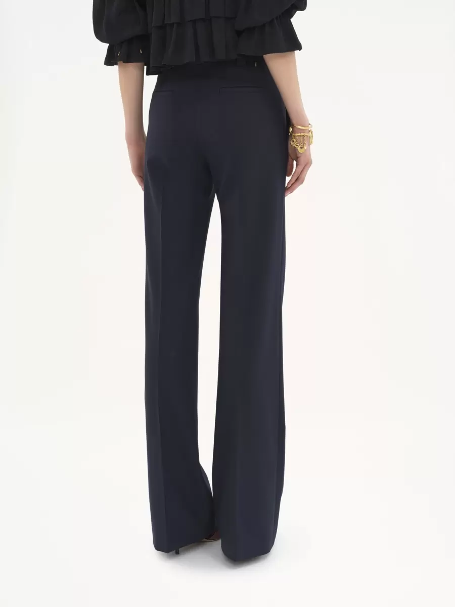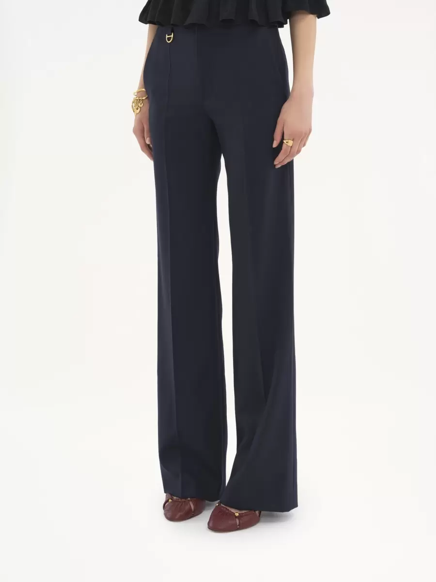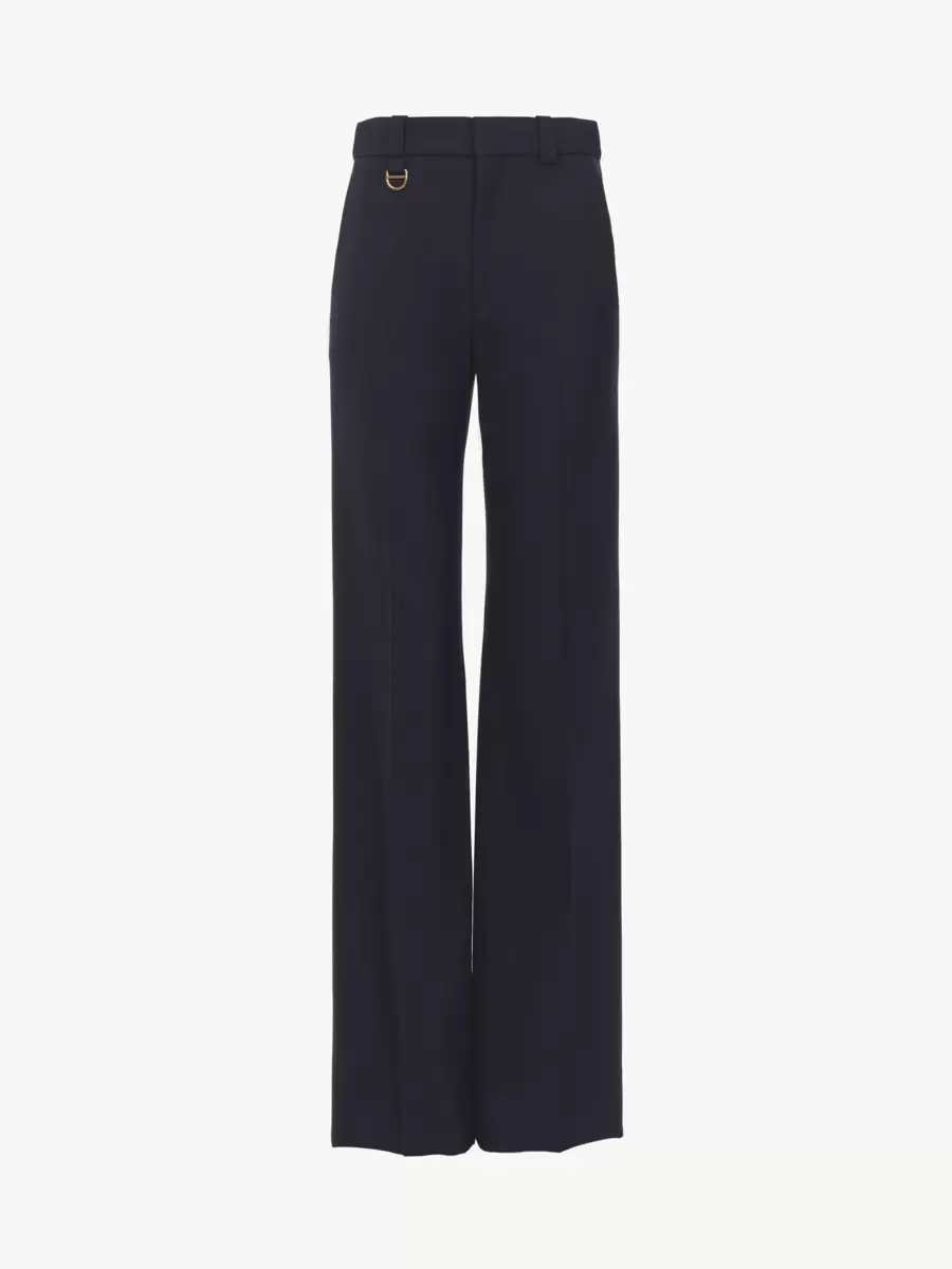 Pantaloni sartoriali maschili in iconica lana elasticizzata a basso impatto, rifiniti con pieghe anteriori stirate e un anello a D color oro sul fianco destro.