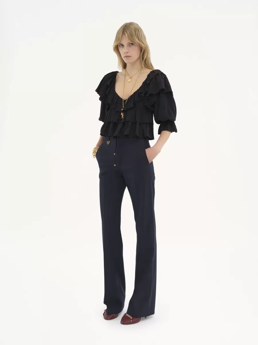 Questo capo è stato creato in collaborazione con Chizé Confection. Partner di lunga data di Chloé, Chizé Confection è una Société Coopérative de Production (SCOP). Questo modello cooperativo si distingue per la sua governance democratica, promuovendo un ambiente di lavoro collaborativo e democratico. Chloé ha firmato un contratto per sostenere finanziariamente Chizé Confection con progetti a beneficio dei suoi dipendenti.