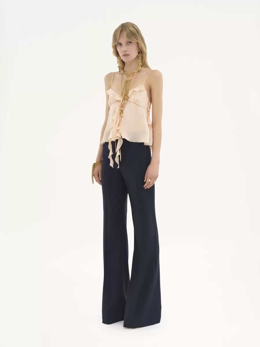 Pantaloni sartoriali svasati in iconica lana elasticizzata a basso impatto, rifiniti con pieghe anteriori stirate.
