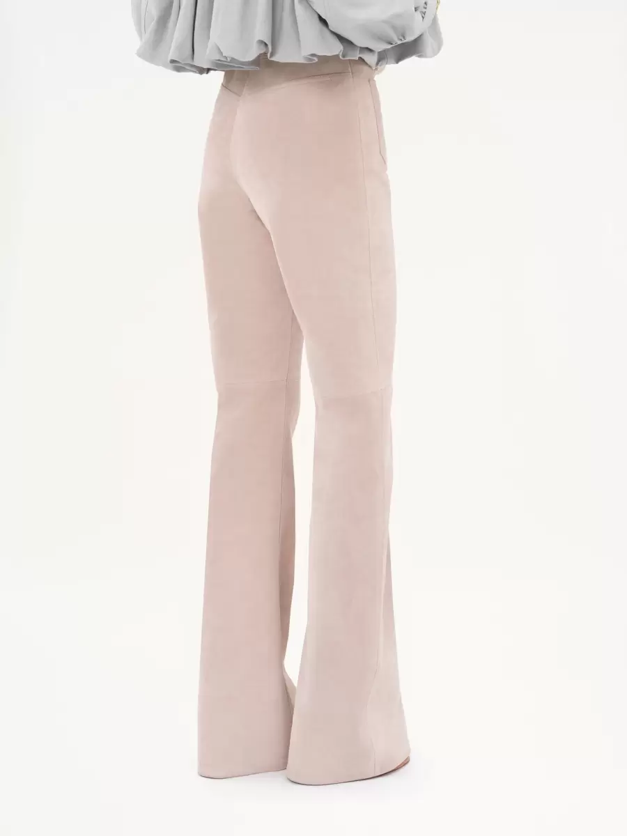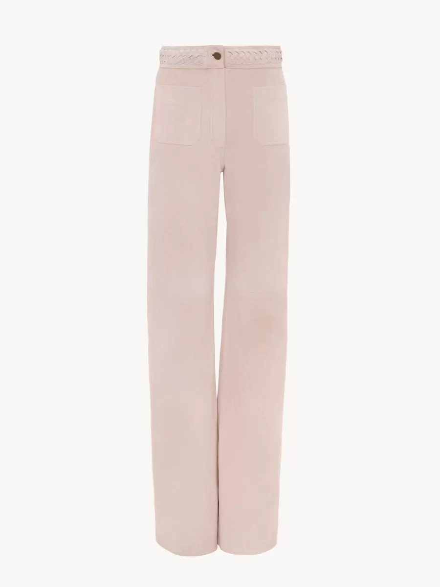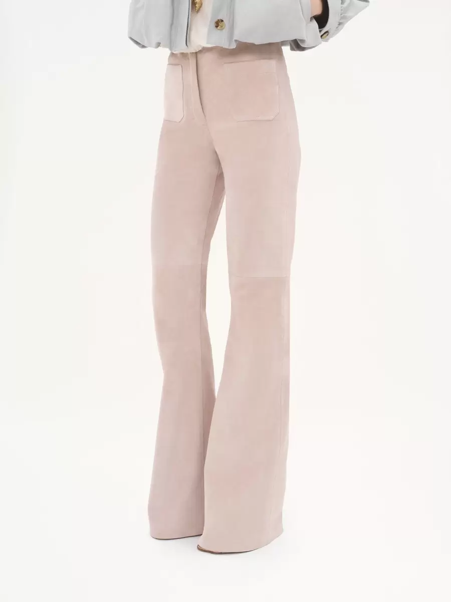 Pantaloni a zampa a vita alta in morbida nappa scamosciata, con tasche applicate e bordo intrecciato in vita.